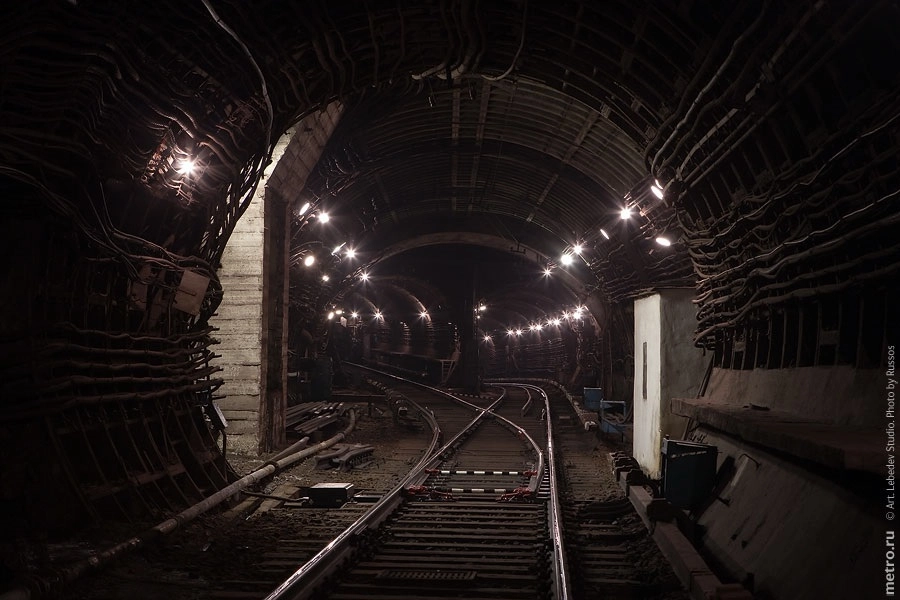 В итоге при удачном стечении обстоятельств может даже сохраниться служебная ветвь между линиями хотя бы по одному из двух тоннелей. К сожалению, ближе к «Площади Революции» осуществить это не получится, здесь снова кривая (путь ветви слева, справа — 2-ой путь Арбатско-Покровской линии от «Арбатской» к «Площади Революции», при этом последняя находится за спиной фотографа):