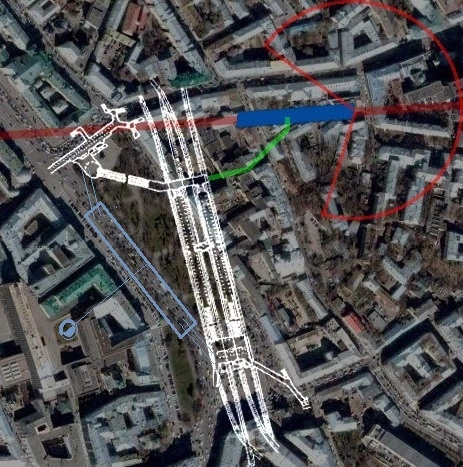 Думаю, что здесь пояснения излишни. Пересадка на Большую Кольцевую линию, вторая станция в узле. Для открытого способа работ придётся строить довольно глубокий котлован, чтобы уйти тоннелями под станцию Большой Кольцевой линии. Отметил примерно голубым цветом, как это может быть: