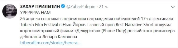 Картина российского режиссера Ленара Камалова «Дежурство» (Phone Duty) победила в номинации «Лучший короткометражный художественный фильм» на 17-м международном кинофестивале Tribeca Film Festival, проходившем в Нью-Йорке. Об этом сообщил в Twitter российский писатель и замкомбата армии ДНР Захар Прилепин.