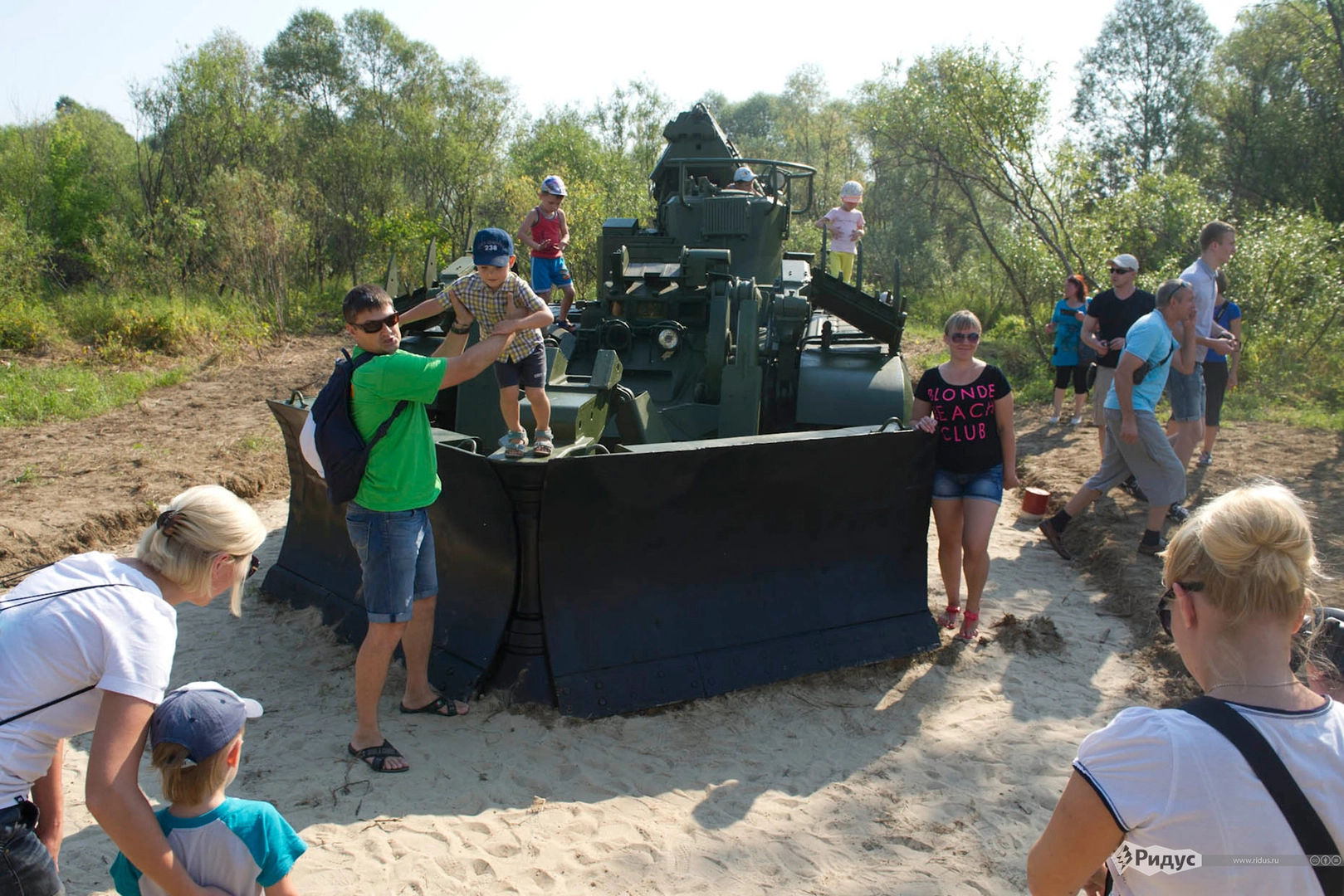 Затем реку самостоятельно форсировали бронемашины пехоты, стрелки на которых параллельно движению по воде вели обстрел предполагаемого противника. Весь этот шум взрывов и автоматные очереди взбодрили зрителей и они, оживившись на такой жаре, начали по настоящему болеть за выбранную команду. А выбор естественно пал на земляков — «зеленую» команду из Мурома.