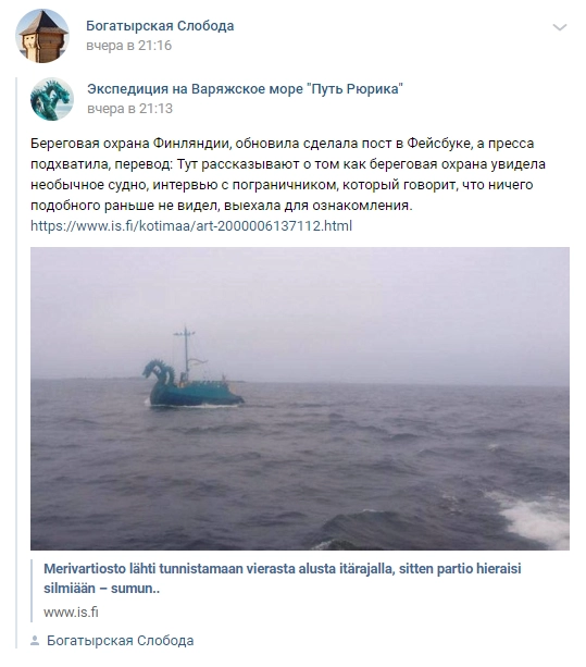 По данным газеты «Известия», когда финский катер и «монстр» пошли на сближение, выяснилось, что перед ними российская яхта с экипажем из семи человек, оформленная в стиле древнерусской ладьи. На носу судна в качестве украшений были вырезаны три головы сказочного Змея Горыныча. Командир корабля объяснил пограничникам, что следует в Норвегию через территориальные воды Финляндии и Швеции.