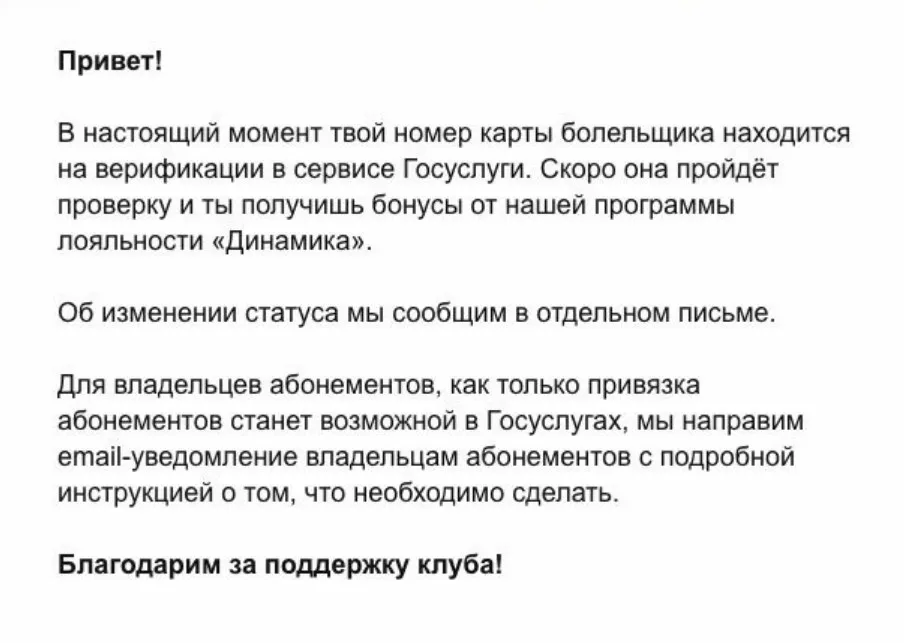 В редакцию «Ридуса» поступила жалоба от футбольных болельщиков, которые покупали билеты на матчи на стадион «Динамо» или официальные мерчи. Им на «Госуслуги» пришли «письма счастья», в которых программа лояльности «Динамика» уведомляла, что в скором времени для пользователей будет готов паспорт болельщика.