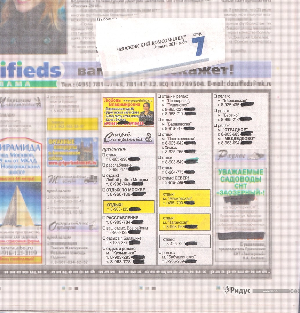 Берем «Московский комсомолец» от 8 июля, общий тираж, если верить выходным данным, 1 963 857 экземпляров. Открываем седьмую страницу, раздел с объявлениями, находим 22 предложения а-ля «отдых», «расслабление», «релакс». Звоним по первому попавшемуся телефону.