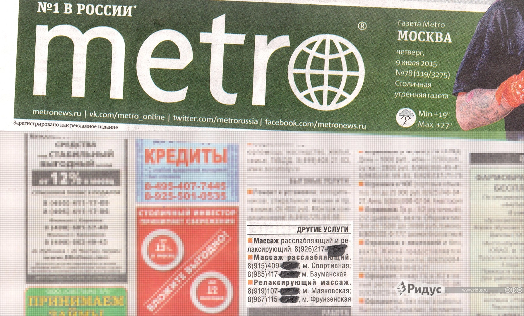 Объявления о массаже находим в бесплатной газете Metro. В номере за 9 июля таких набралось три: «массаж расслабляющий», «массаж релаксирующий» и просто «массаж». Первые два номера действительно предлагают просто эротический массаж, можно и с двумя девушками. Час или три доведения до оргазма — 1,5 тысячи рублей.