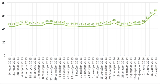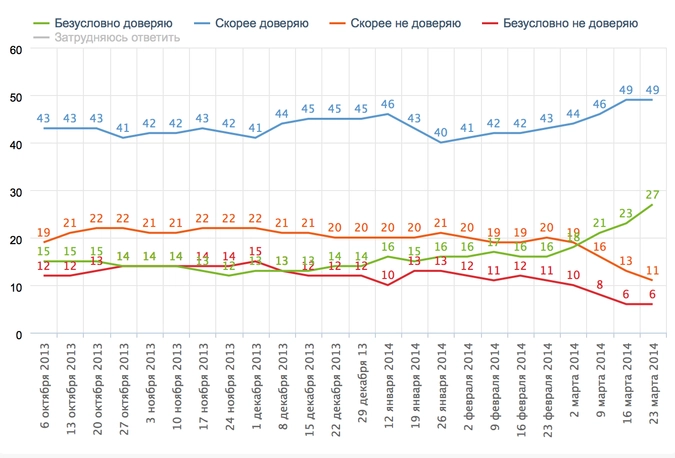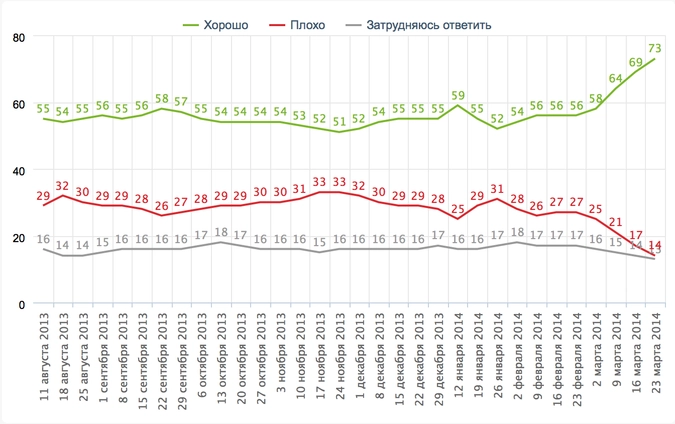 «Очевидно, рейтинг связан с возвращением Крыма в состав Российской Федерации, это показывают и другие опросы, которые показывают, что подавляющее число россиян приветствует это решение и считает это восстановлением исторической справедливости, воссоединение братских народов. Также цифры демонстрируют реакцию на выступление Владимира Путина в Кремле перед российскими парламентариями. Это послание привлекло самое большое внимание россиян из всех его выступлений за последние несколько лет. Даже принципиальные оппоненты Путина признают, что набор аргументов был довольно четким и емким. Эти два события и сыграли на то, что цифры оказались крайне солидными».