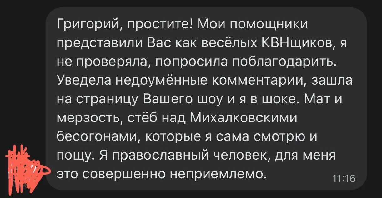 Они пояснили, что руководителю «Дома белого аиста» Марии Сиденко не нравится контент шоу: «Она, как православный человек, не приемлет „мат и мерзость, стеб над михалковскими бесогонами“, которые она сама смотрит».
