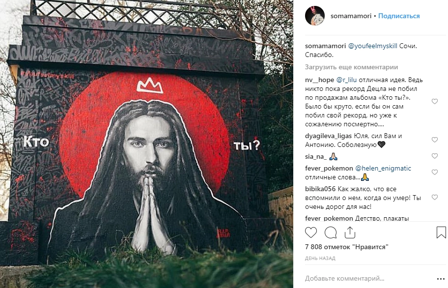 Вдова музыканта Юлия Толмацкая поблагодарила создателей памятного граффити в Сочи.