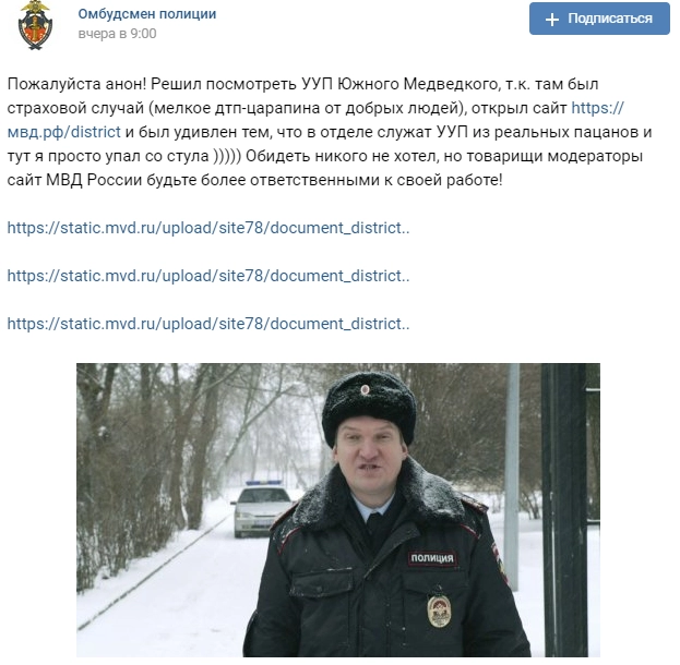 Подписчики «Омбудсмена полиции» считают произошедшее шуткой или халатностью администратора сайта. По данным «Ридуса», сейчас часть «сериальных» фотографий уже удалена из профилей участковых на мвд.рф.
