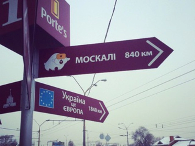 На стрелках указателя сделаны надписи «Москалі - 840 км», «Україна це Європа — 1840 км», снабженные пиктограммами.