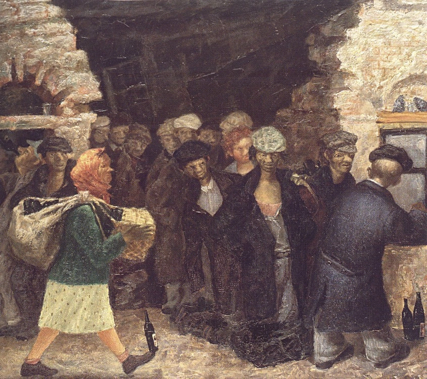 02. «0,5 не принимают». Картина, посвященная пунктам приёма стеклотары. Сам пункт находится, судя по всему, в каком-то полузаброшенном дореволюционном доме, а ещё впечатляет конструкция для переноски пустых бутылок (из мешка и плетеной корзины), которую соорудила женщина на переднем плане.