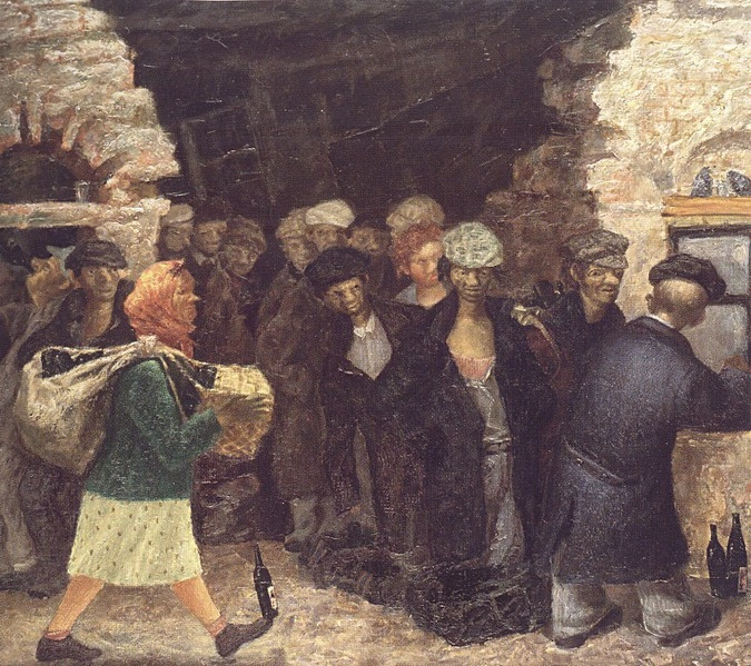 04. «Бульварная сцена». Тут изображены дядьки, которые пьют горькую прямо где-то на заснеженном бульваре. На заднем плане можно увидеть дворничиху (кстати, советский феминитив), убирающую снег.