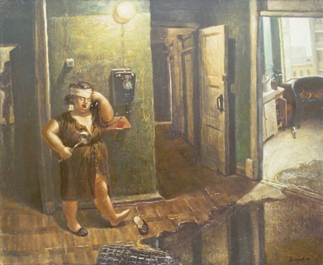07. Картина под названием «Алё», изображающая быт советской коммунальной квартиры. Тётка с замотанной головой вышла из кухни в коридор поговорить по общему квартирному телефону — в коммунальных квартирах такие телефоны оставались до самого начала девяностых годов.