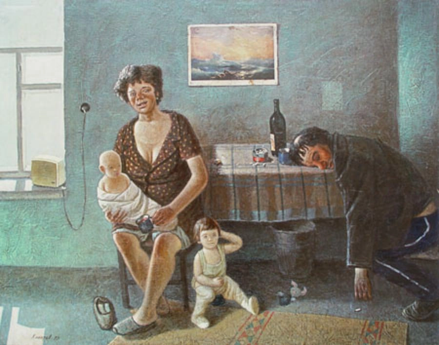 08. «Девятый вал». Одна из самых известных и наиболее страшных картин Колотева. На столе спит муж-пропойца в синих советских трениках, а жена с грудным ребенком на руках и вторым ребенком на полу сидит с видом совершеннейшего отчаяния и отрешенности.