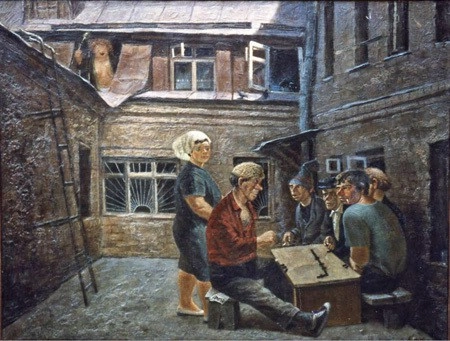 03. «Воскресение». Картина, изображающая какой-то закрытй забором двор, в котором мужики потягивают пиво в выходной день. Кстати, свою картину Василий подписал не «Воскресенье», а «Воскресение», так что может быть тут имеется в виду не день недели, а скажем «воскресение после тяжелой попойки посредством опохмела пивом».