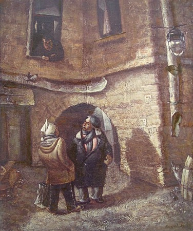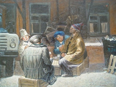 11. «Крести-козыри». Игра в карты каких-то грузчиков и продавщиц на заднем дворе магазина. На мусорном баке кривыми буквами выведено «ЖЭК».