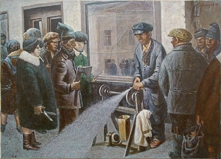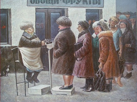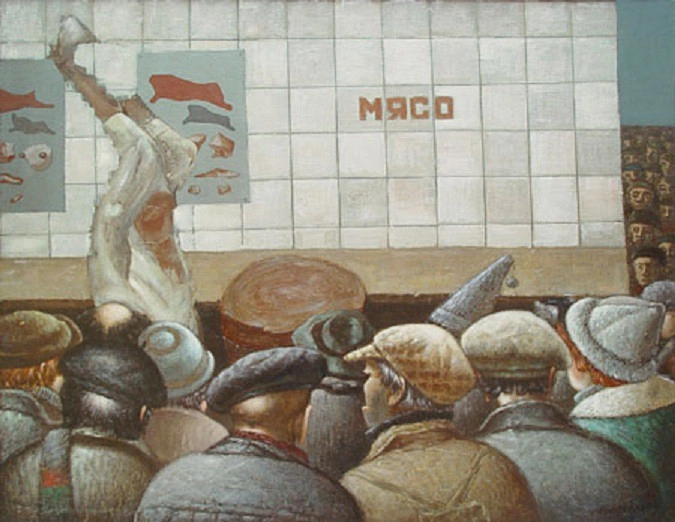 18. «Очередь». Полотно изображает гигантскую очередь к продуктовым прилавкам, при этом в прилавках-холодильниках можно увидеть крайне скудный ассортимент. В центре композиции — советские рычажные весы, которые нередко становились предметом махинаций и спекуляций недобросовестных продавщиц.