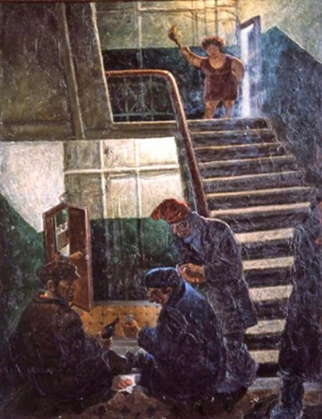 16. «На лестничной клетке». Картина изображает классическое трио «соображателей на троих», обосновавшихся в подъезде между этажами.
