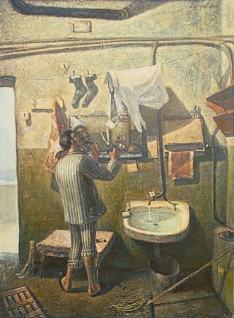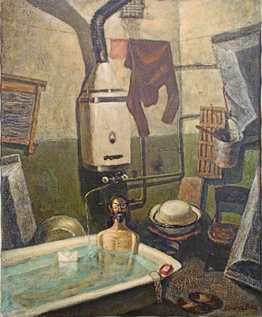 21. Несколько бытовых сцен из жизни коммунальных квартир. Картина «Плывёт, плывёт кораблик», изображающая ванную комнату в коммунальной квартире.