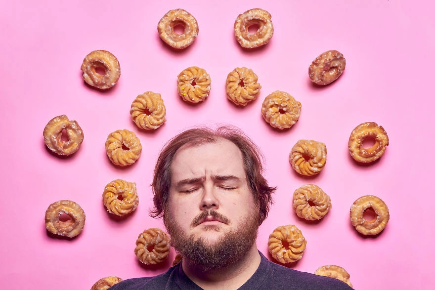 «Когда я задумал серию „DiscomfortFood“, этот образ был одним из самых важных во всей серии. Сметанные глазированные пончики — мой второй любимый тип еды».