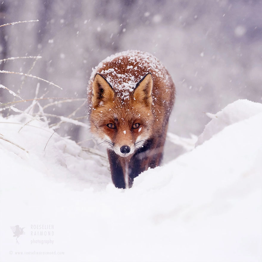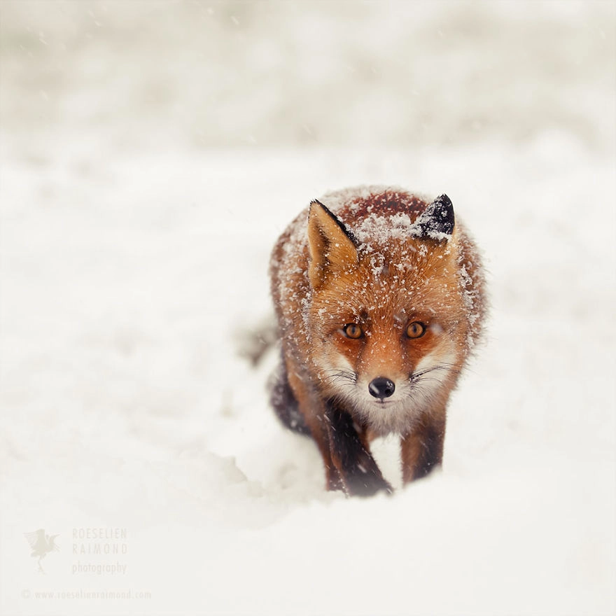Голландский фотограф дикой природы Руселин Раймонд (Roeselien Raimond) уже восемь лет снимает лисиц. Интерес к этим загадочным рыжим зверям начался с мифов и легенд, а потом перерос в решимость доказать всему миру, что лисы — вовсе не злые обманщицы, какими их рисуют в сказках. Недавно в Нидерландах выпал снег, и голландец успел поснимать лисиц в сказочных заснеженных пейзажах. И в этих кадрах явно прослеживается искренняя любовь фотографа к этим хитрым рыжим зверям.