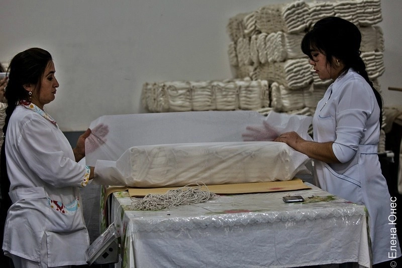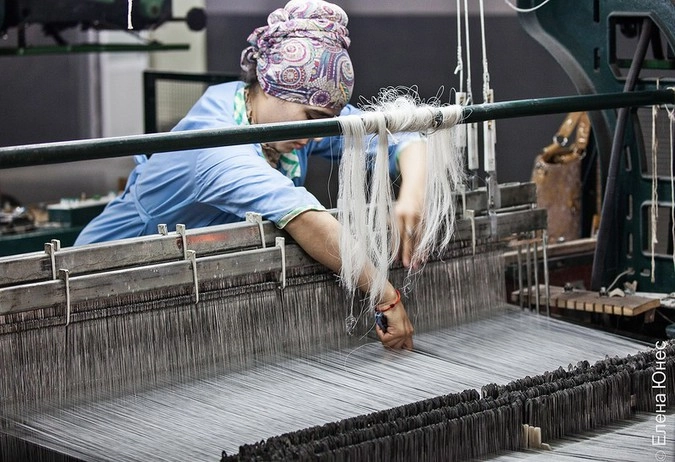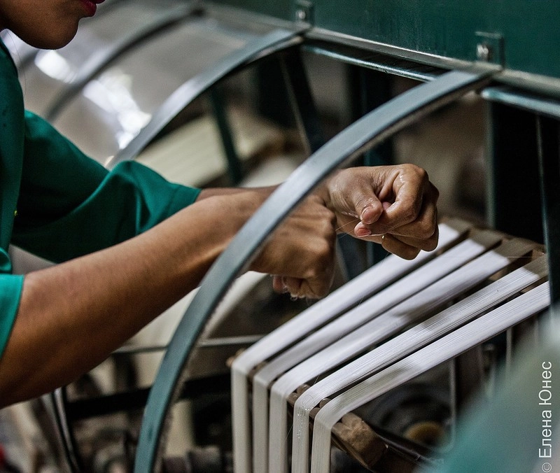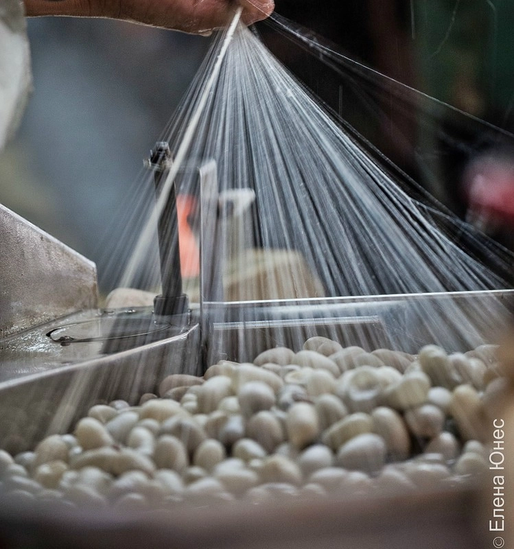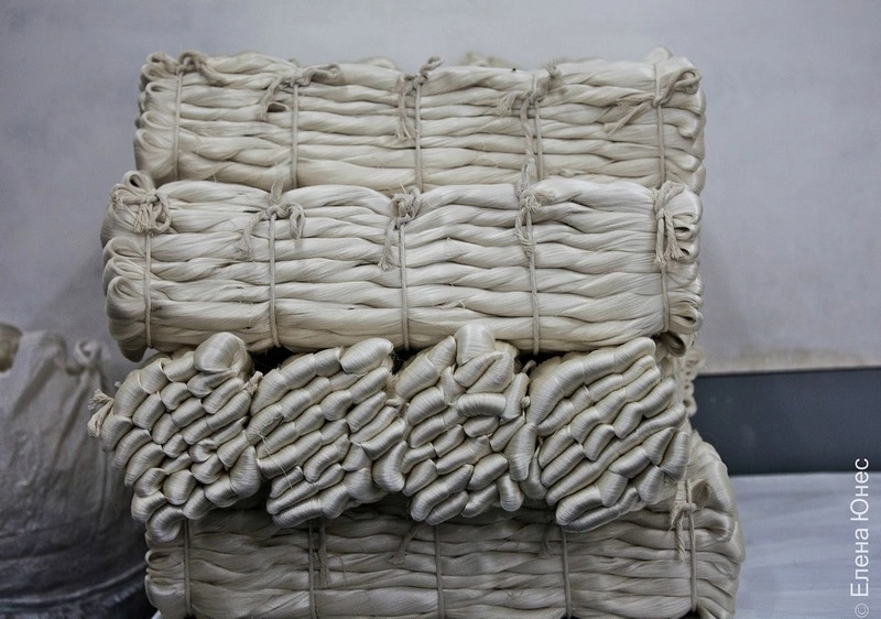 После этого мотки шелковой пряжи прессуются и упаковываются. Другая часть идет на изготовление ткани.
