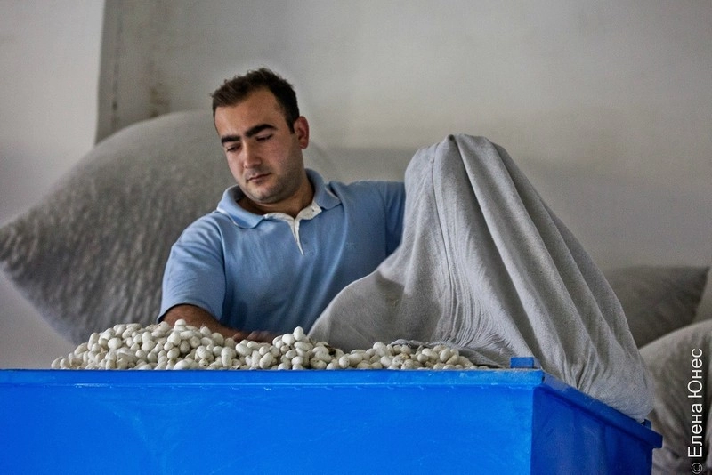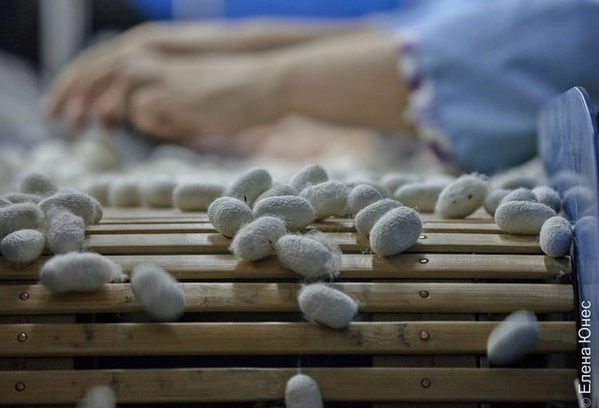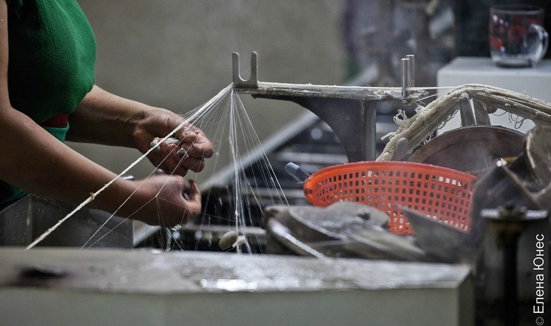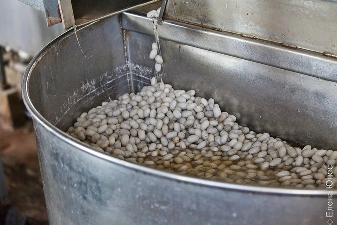 Коконы сортируют вручную и затем погружают в чаны с горячей водой для получения шелковых нитей.