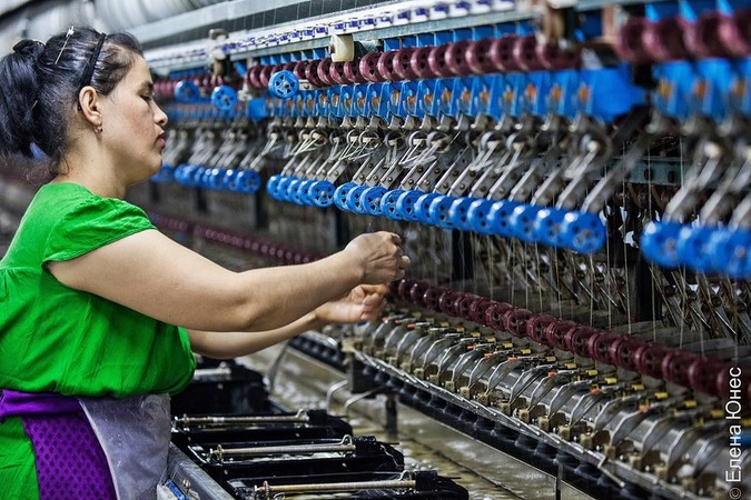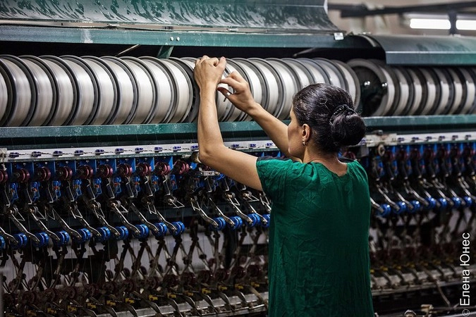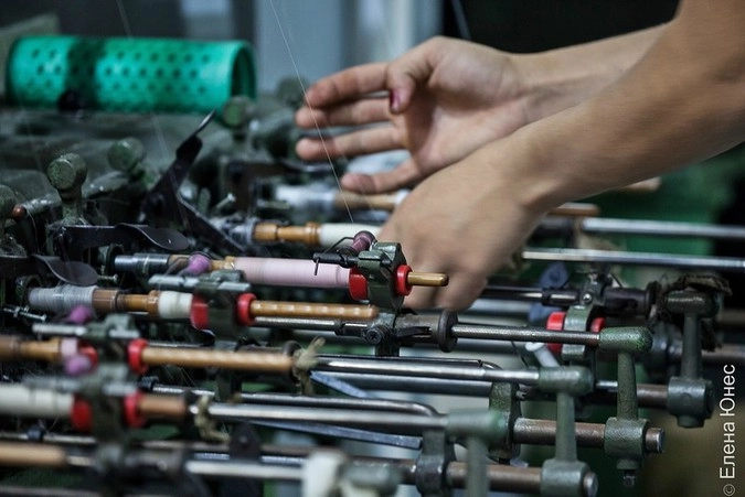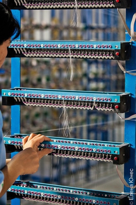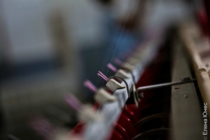 Затем нить доставляется в станки, где работницы находят конец нити и проводят через глазок спицы.