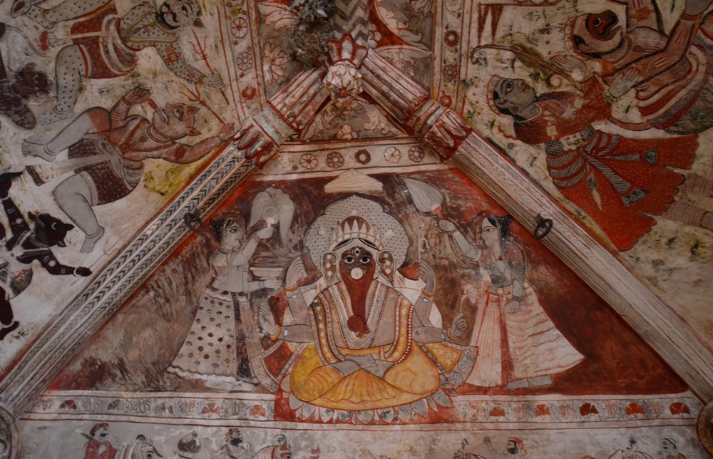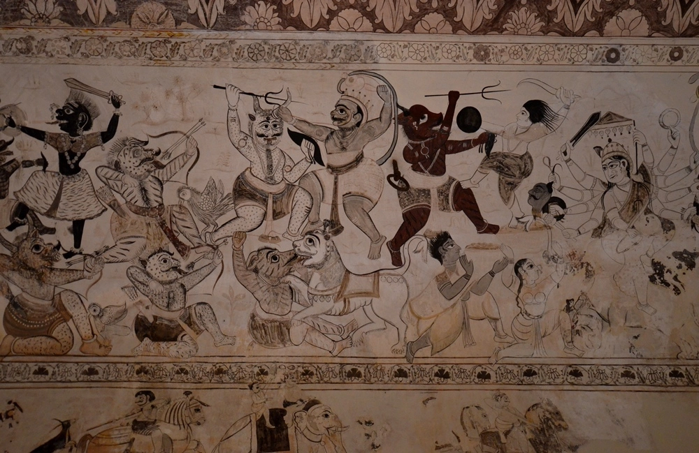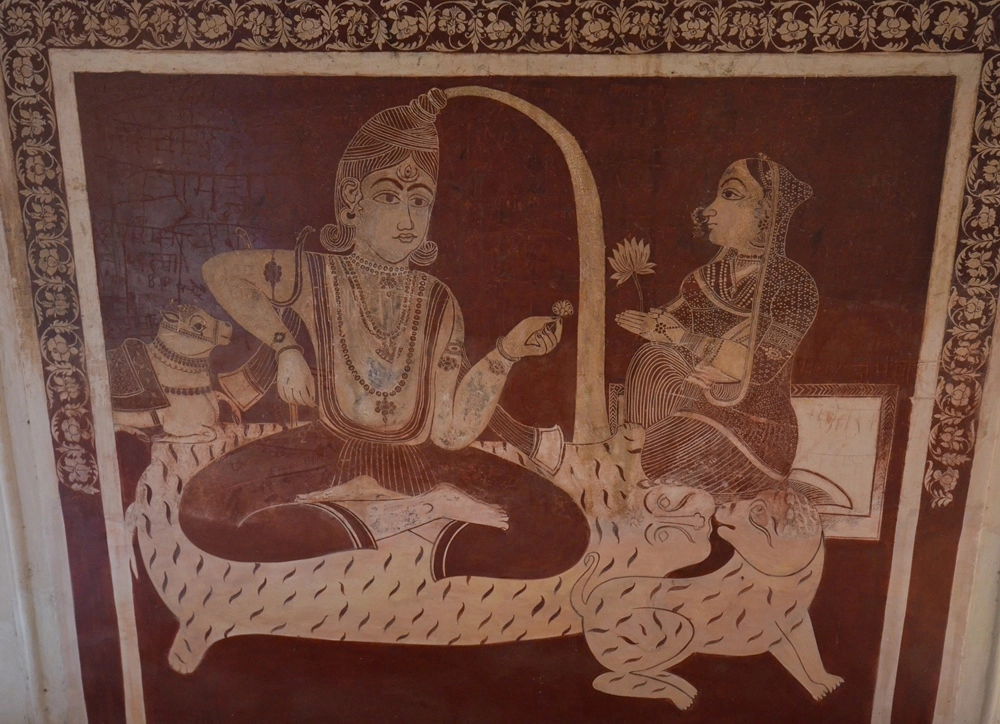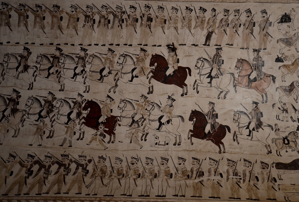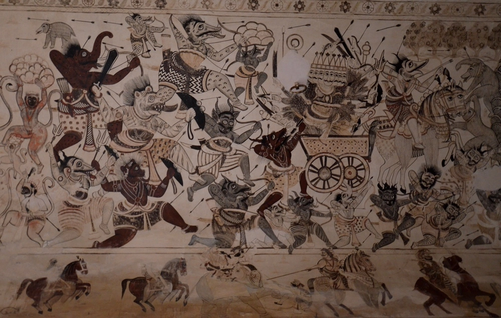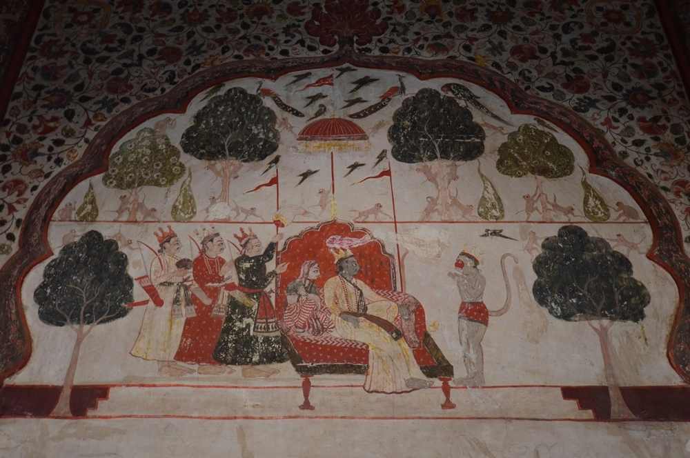 В каменном коридоре на входе в крепость — индийские фрески. Справа на картинке — «бог-обезьяна» Хануман, в индуизме чтимый как покровитель наук и деревенской жизни.