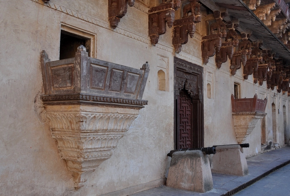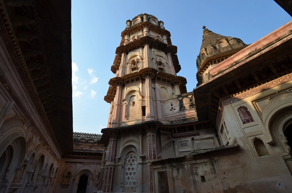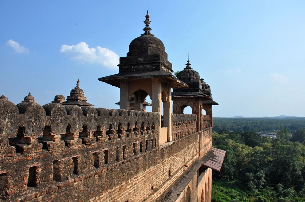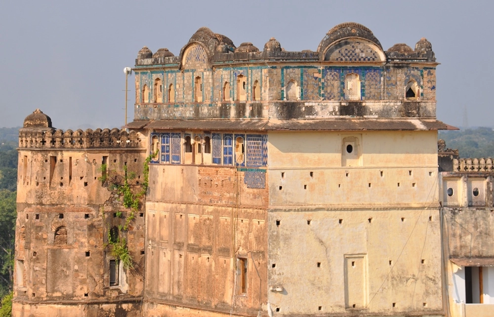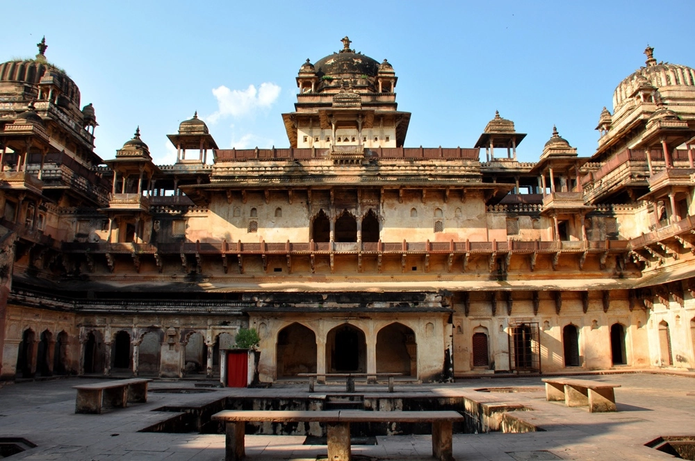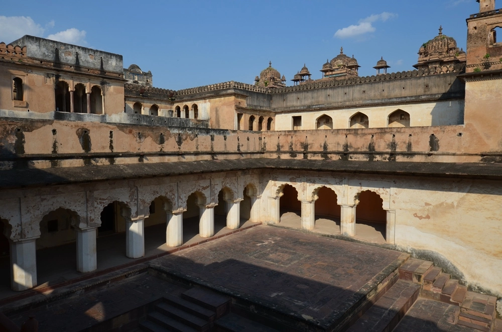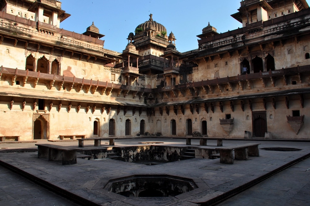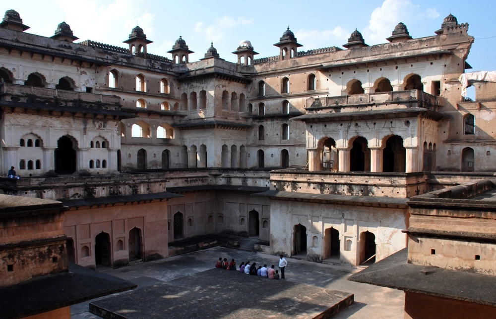 Дворцы местных правителей раджпутов находятся внутри крепости на острове, образованном двумя рукавами реки Бетвы. Пройдя мощные крепостные ворота, оказываемся на небольшой внутренней площади.