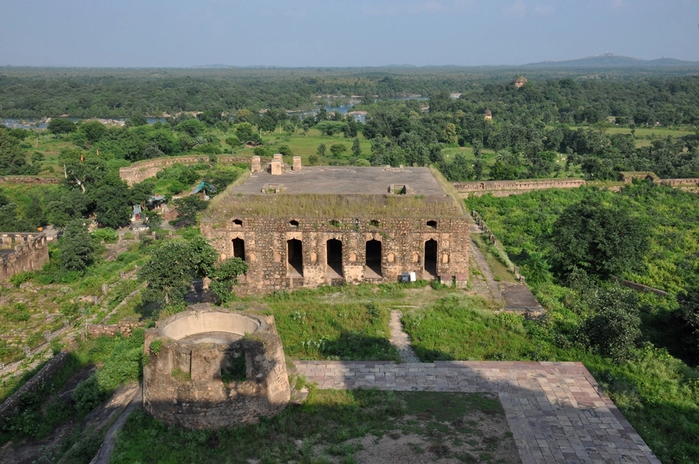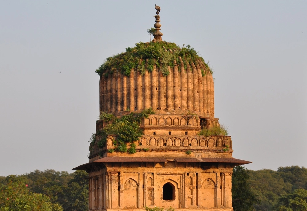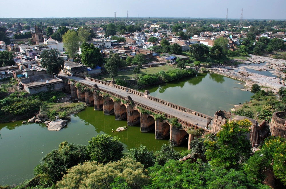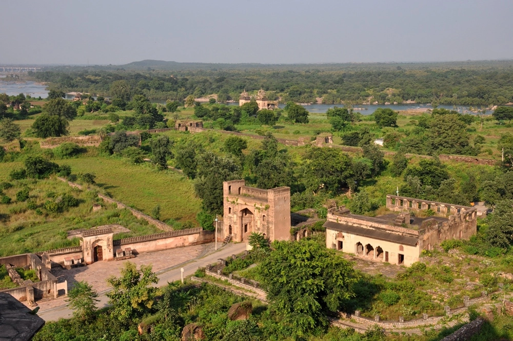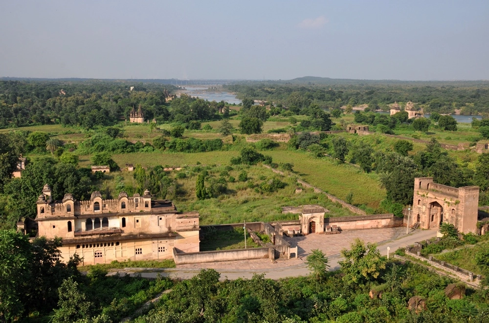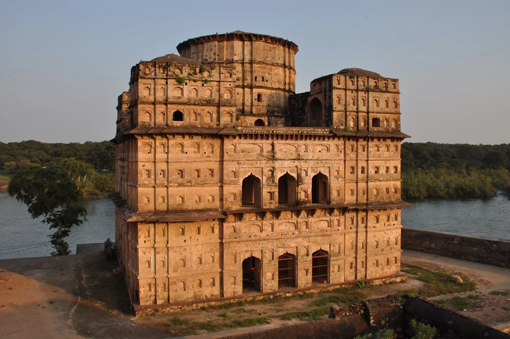 На дальнем плане видна река Бетва, а на переднем — дворец Райправин-Махал, построенный якобы специально для любимой раджпутской наложницы Рай Правин.