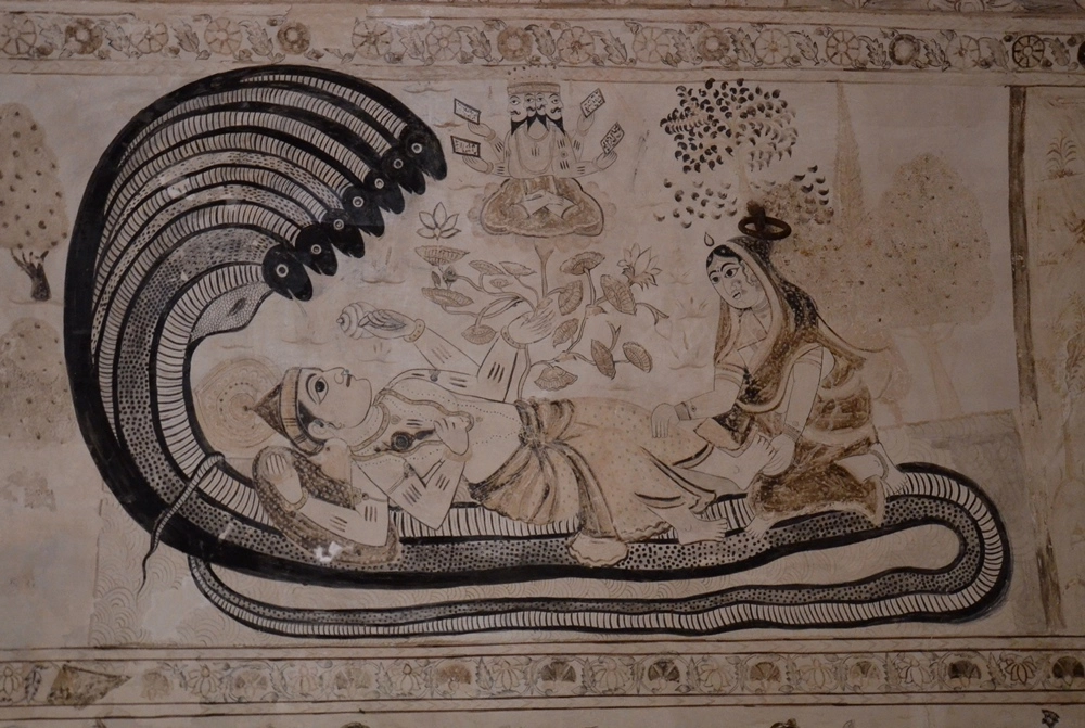 В каменных залах и галереях храма как всегда привлекают внимание фрески, рассказывающие об истории, религии и мифологии Индии. На этой фреске, как я понимаю, — Священный Ганг.