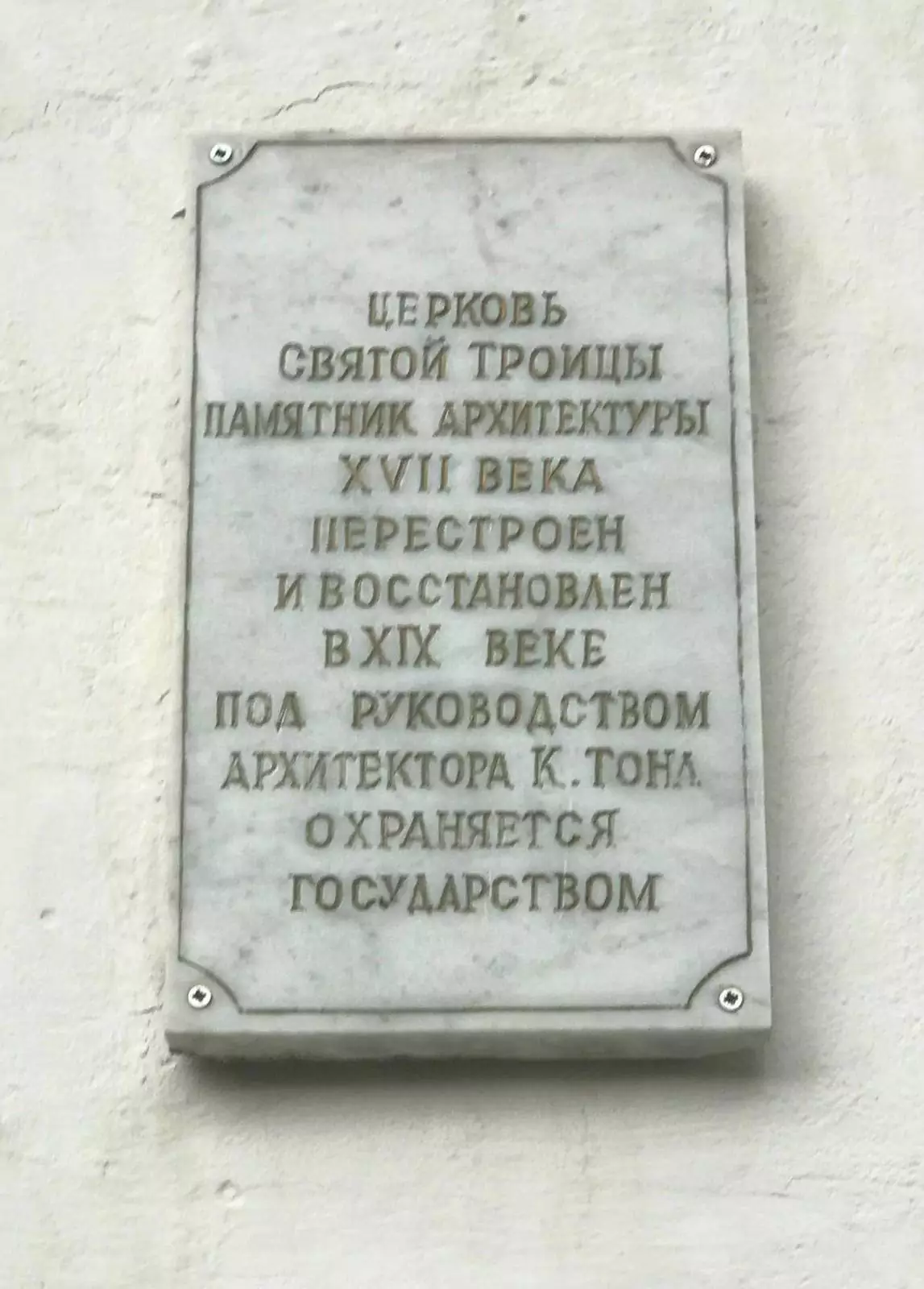 Церковь Святой Троицы находится на правобережной стороне города, к югу от Спасо-Преображенского монастыря. Точная дата строительства деревянной церкви неизвестна. Но в первой описи города, проведённой по приказу царя Михаила Фёдоровича в 1625 году, она числится сожжённой «литовскими людьми» в 1607 году (7117 год). Этот факт отражён в Писцовой книге 1624 года: «На Троетцкой улице место церковное, что был храм Живоначальные Троицы, сожгли литовские люди в 117-м году; вдоль церковного места дватцать сажен, а поперег десять сажен». Более 70 лет место было пустынным. В 1680 году на прежнем месте на средства купца Якова Тверева была выстроена каменная церковь Святой Троицы. Она была освящена 13 декабря 1684 года лично митрополитом Новгородским и Великолуцким Корнилием.