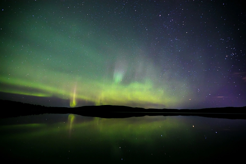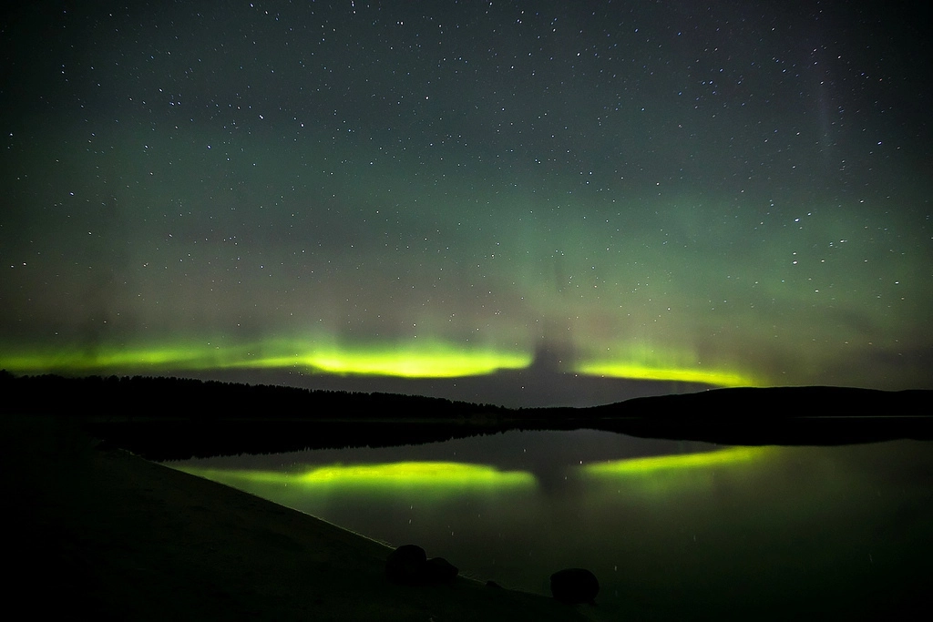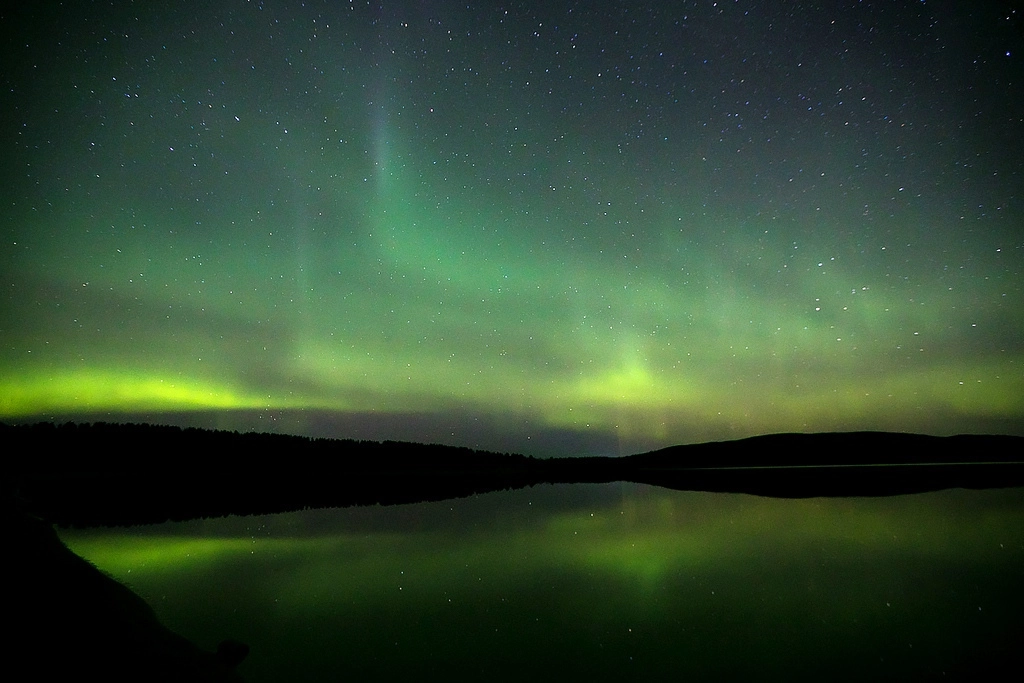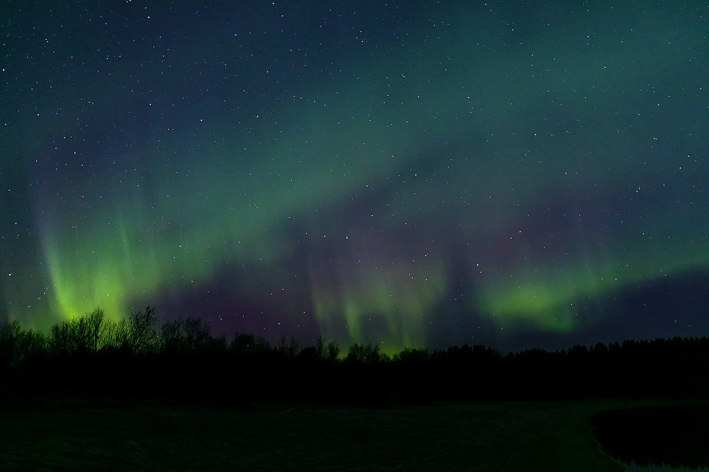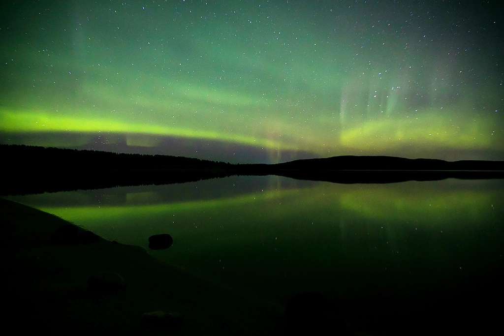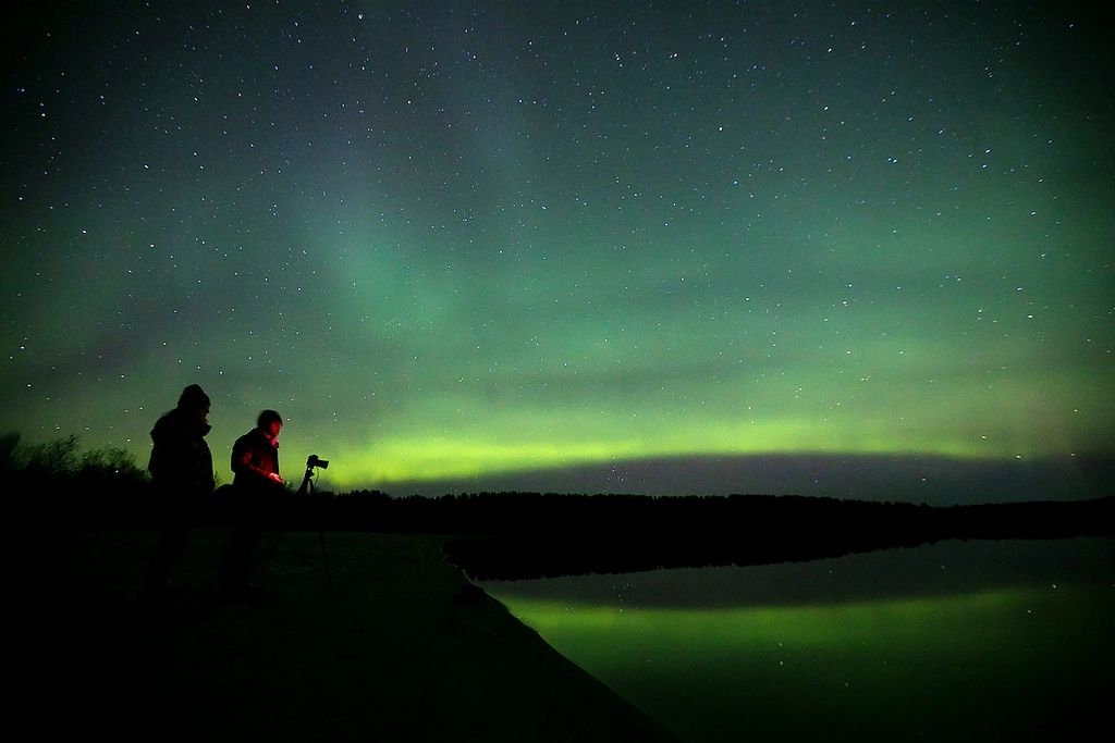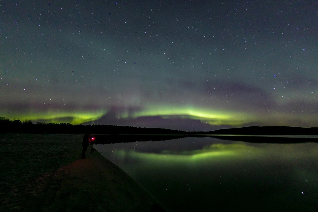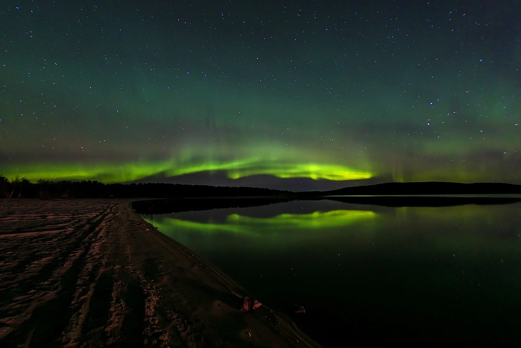 Конечно, на самом деле мы долго ехали и вглядывались в каждое облачко на небе, пытаясь представить, что это то самое чудо. Но по итогу мы действительно оказались в полной темноте возле спокойного водоема, в зеркале которого отражались звезды, над которым в небе кто-то будто рисовал постепенно исчезающими неоновыми красками.