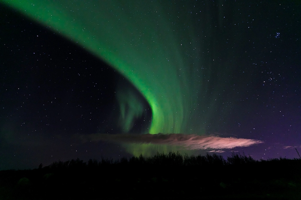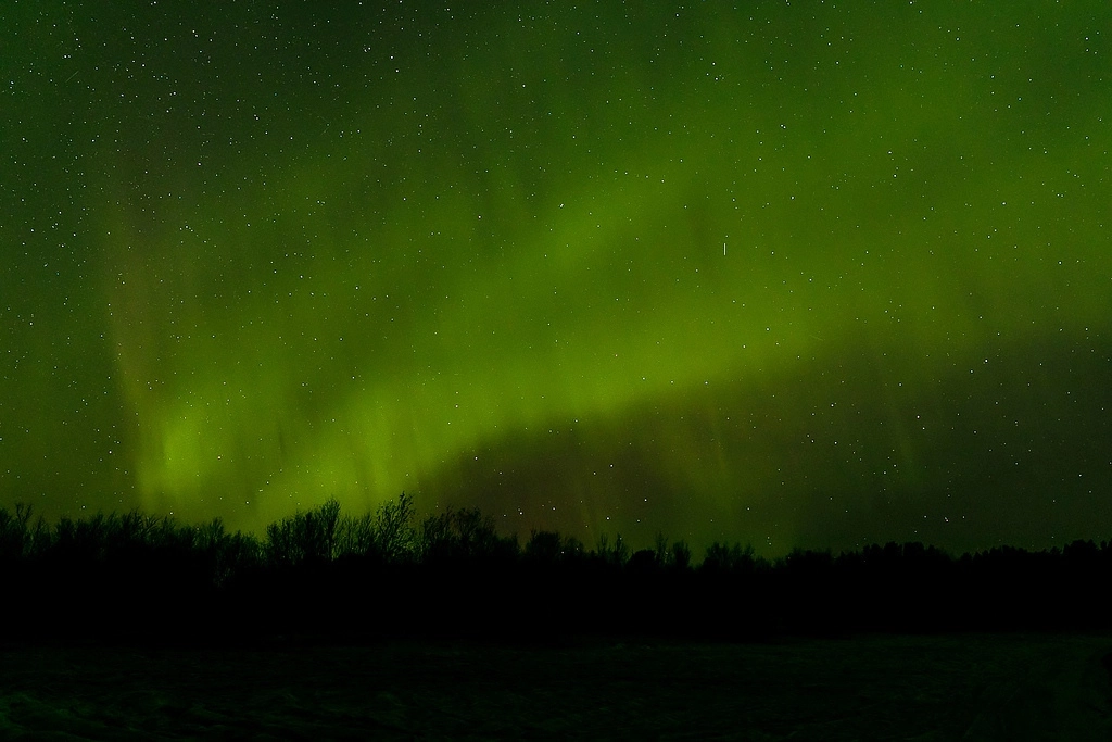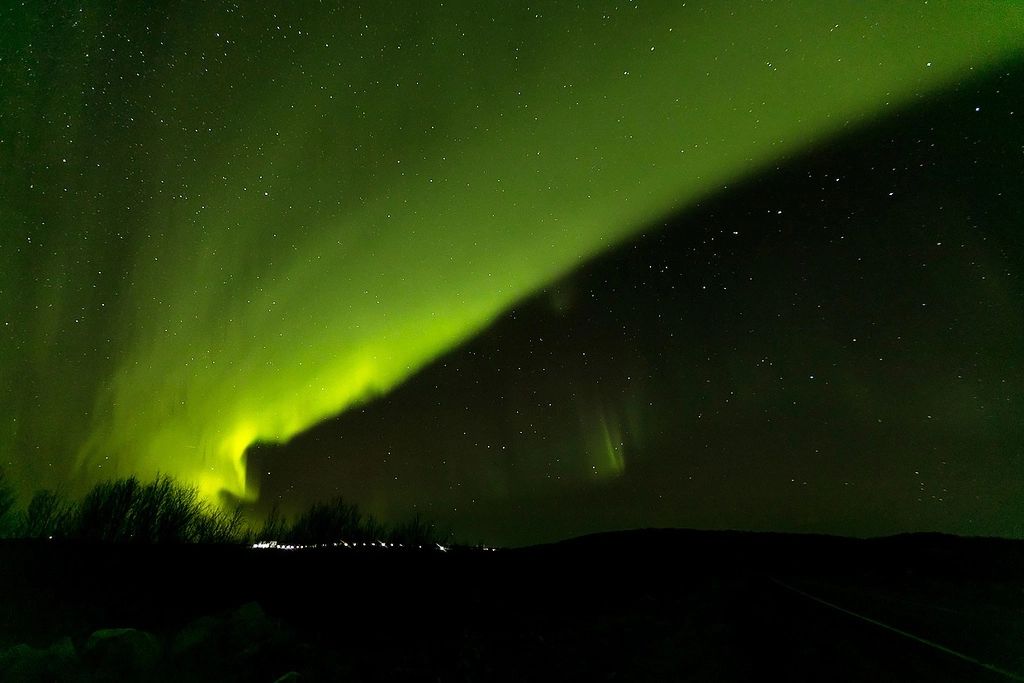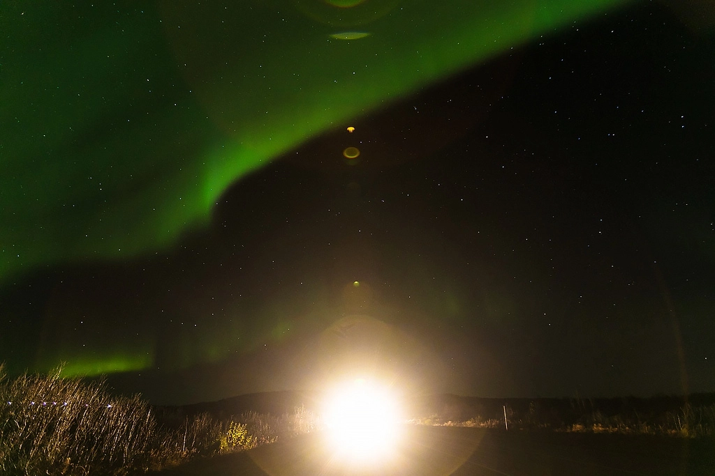 На обратном пути приключения охотников за сиянием продолжились — мы снова увидели всполохи, теперь еще ярче и больше. Только дикое желание спать увело нас с той дороги.
