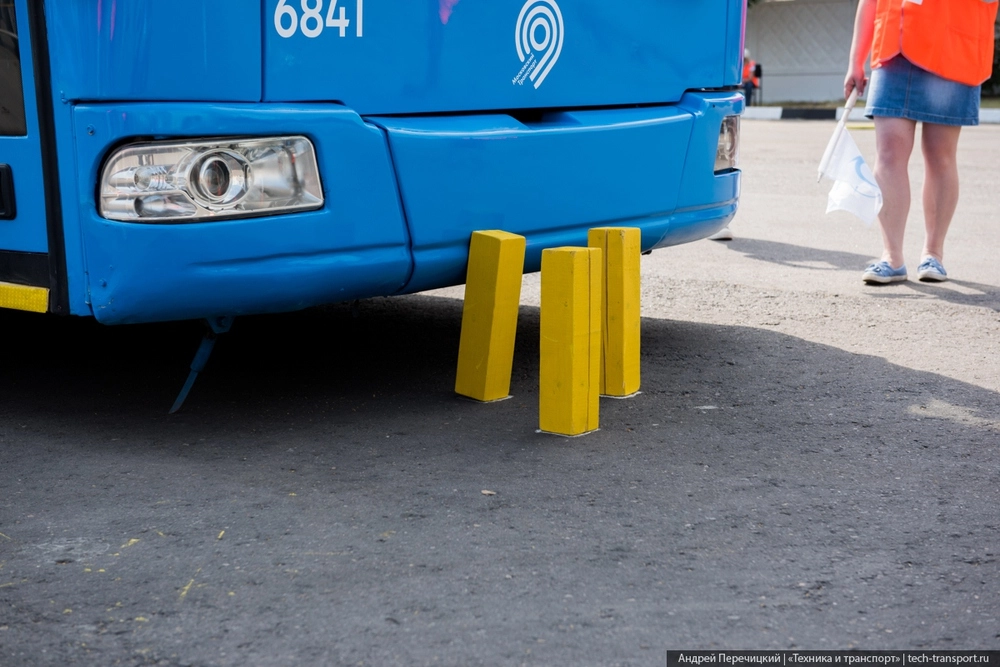 Третье испытание имитирует самое частое действие водителя в работе — подъехать к остановке, открыть двери, объявить остановку. Стойки имитируют остановку в кармане