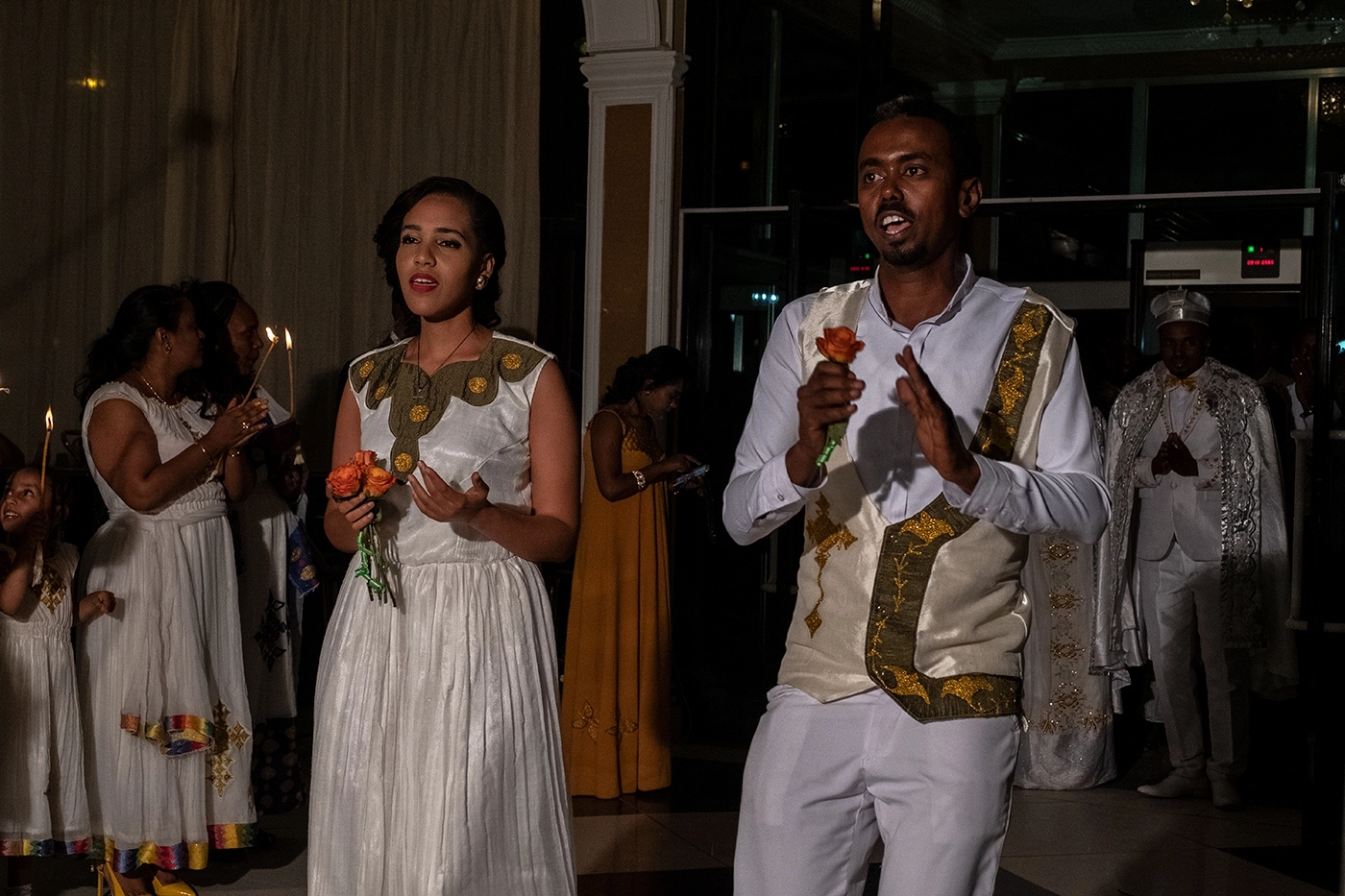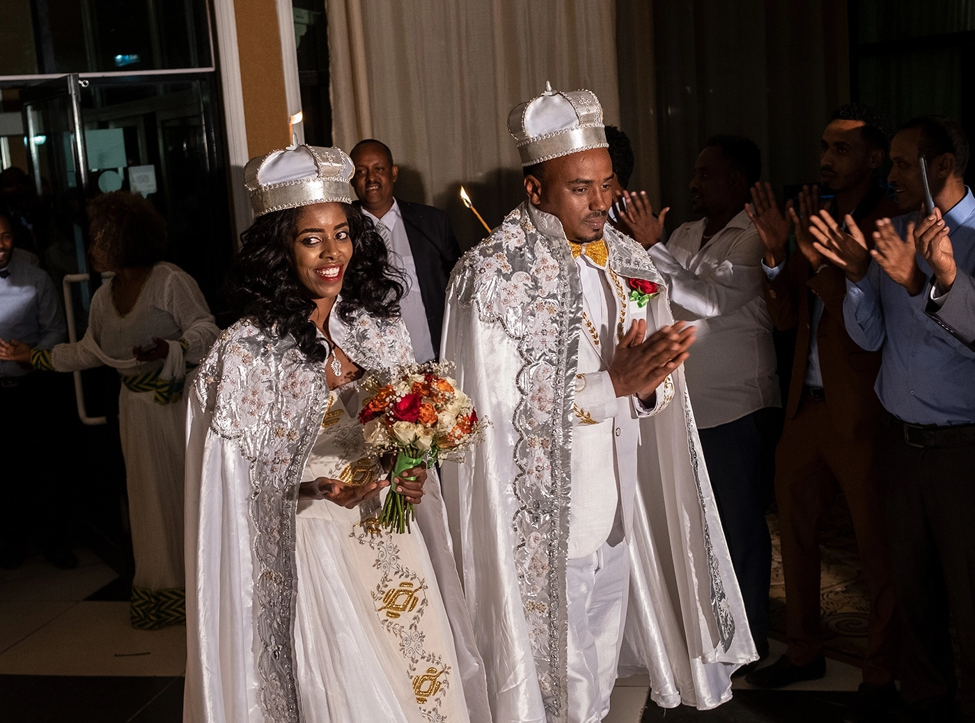 С барабанами, аркой из цветов, свечами, жертвоприношением, наряженными подругами невесты, епископом и прочими атрибутами африканского торжества.