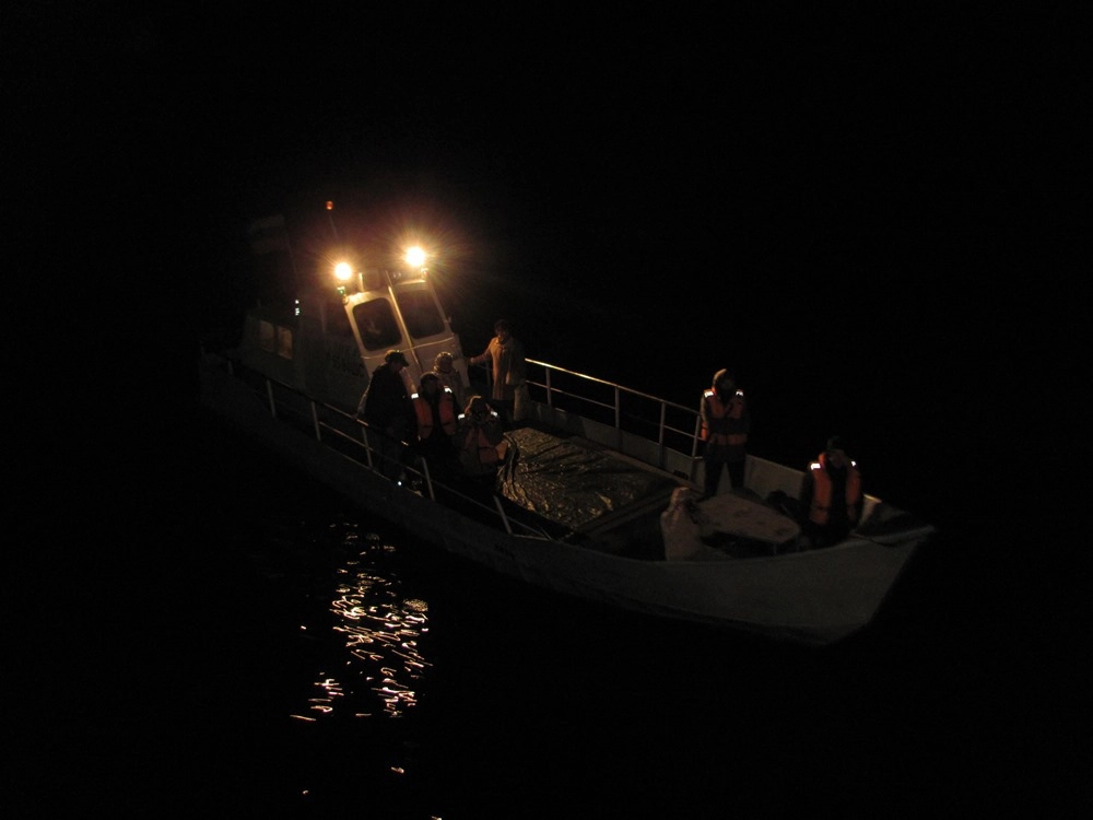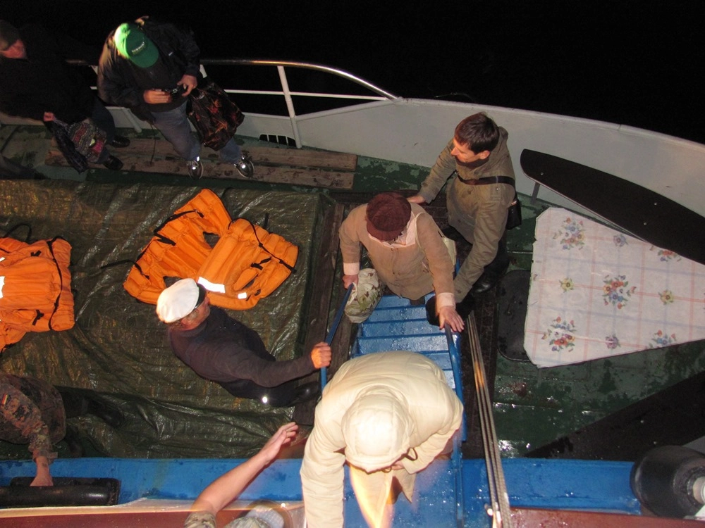 Теплоход стоит на острове Пеллотсаари до поздна — ждём группу туристов, которая утром из Сортавалы отправилась на длительную экскурсию в Ново-Валаамский монастырь в Финляндию. Группа вернулась несколько позже запланированного — на обратном пути задержались на границе. Наконец, к борту пришвартовался катер, доставивших туристов с «большой земли».