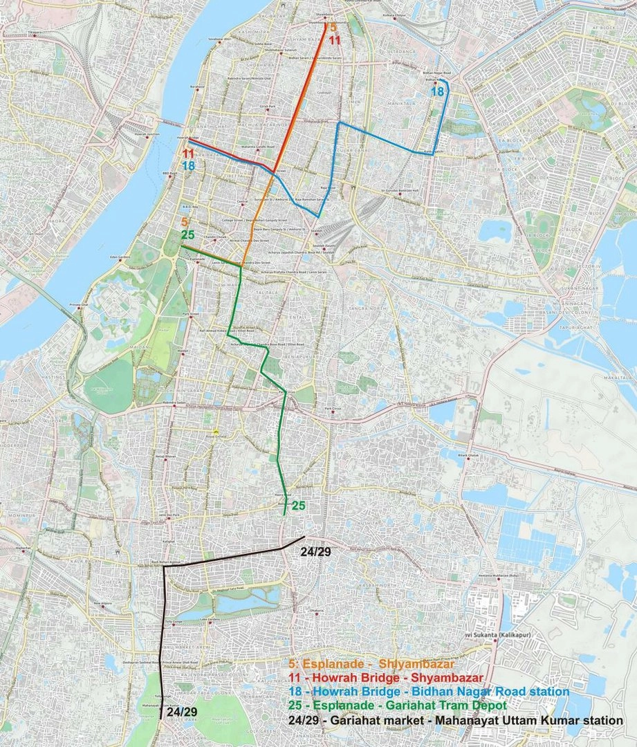 Еще лет 15 назад сеть калькуттского трамвая была довольно обширна. Сейчас же от того великолепия осталось, по сути, 4 маршрута. Еще один (11-й) работает как подстраховочный.