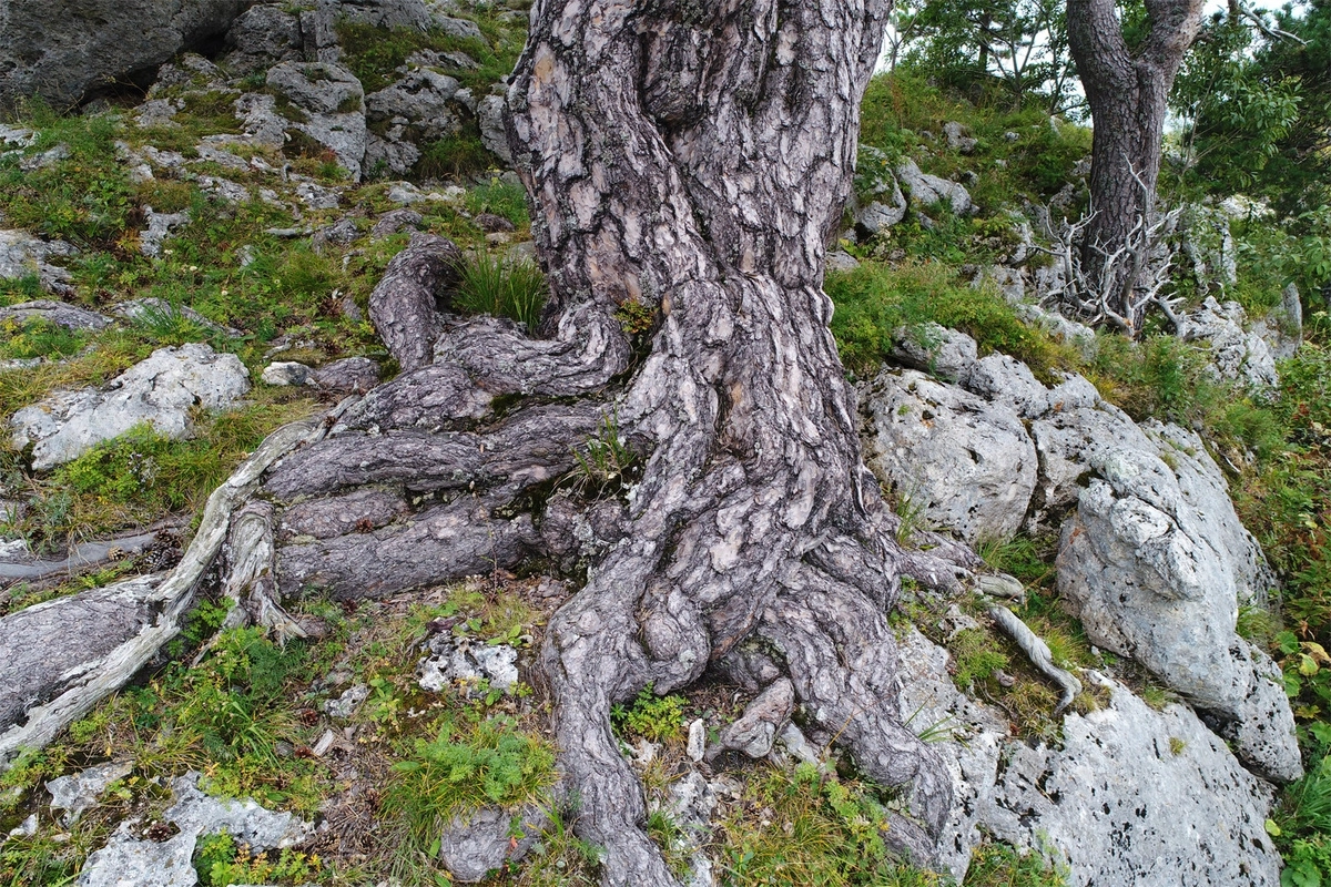 Как и у людей, у деревьев свои судьбы. Немногие доживают до предельного возраста, особенно в сложных условиях. Сосна на плато Лагонаки, живущая на верхней границе лесного пояса.