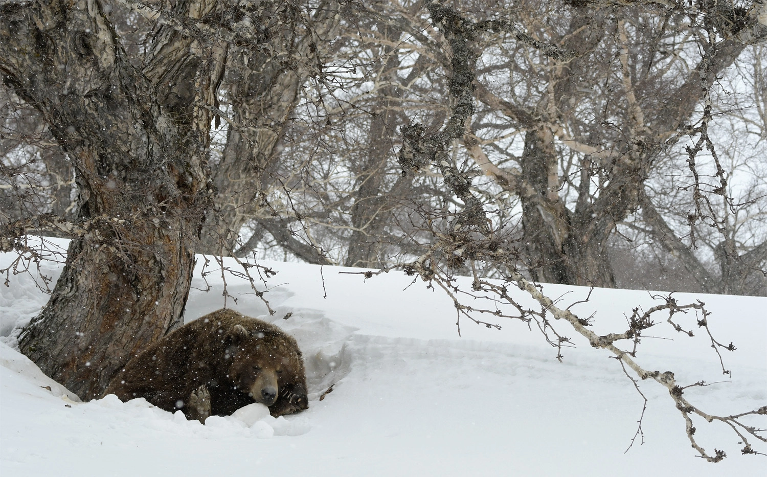 Медведь пережидает весеннюю метель под старой каменной березой. Южно-Камчатский федеральный заказник.