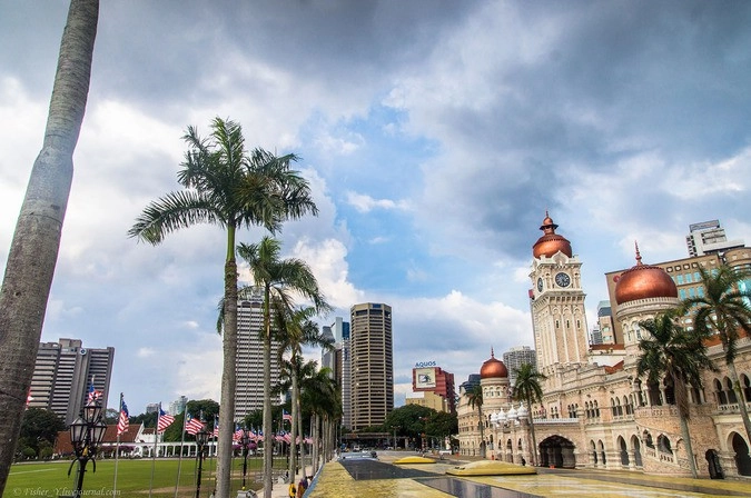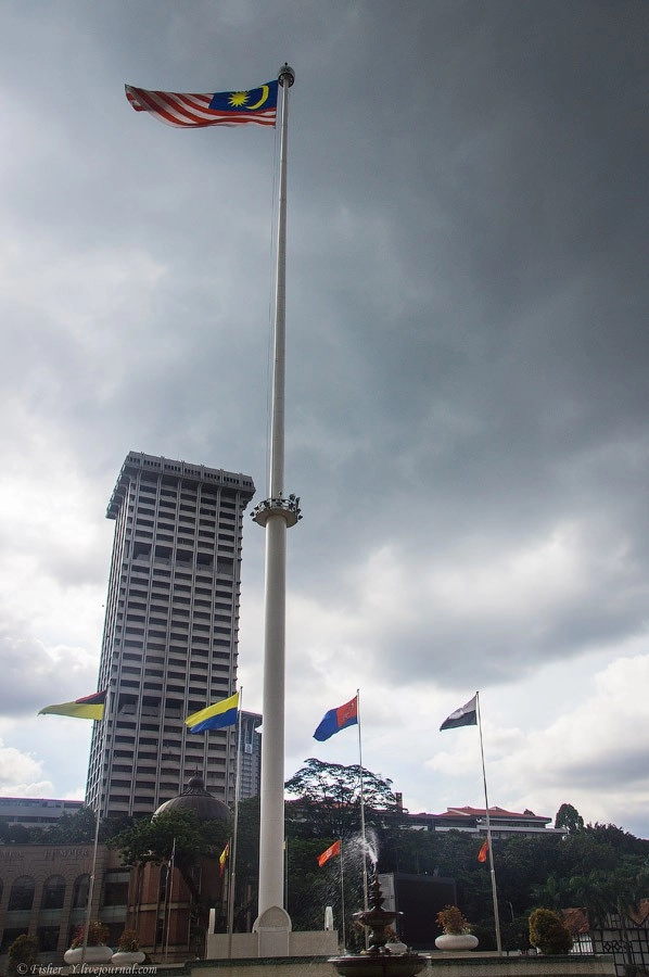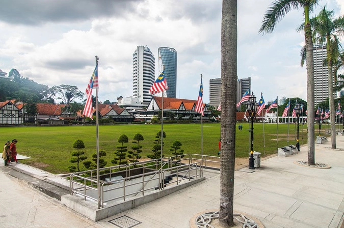 Вот сама площадь. Невысокие здания с красной крышей с той стороны площади, это Королевский Клуб Селангор. Высокие здания на заднем фоне слева Университет Tun Abdul Razak, справа штаб квартира департамента общественных работ.