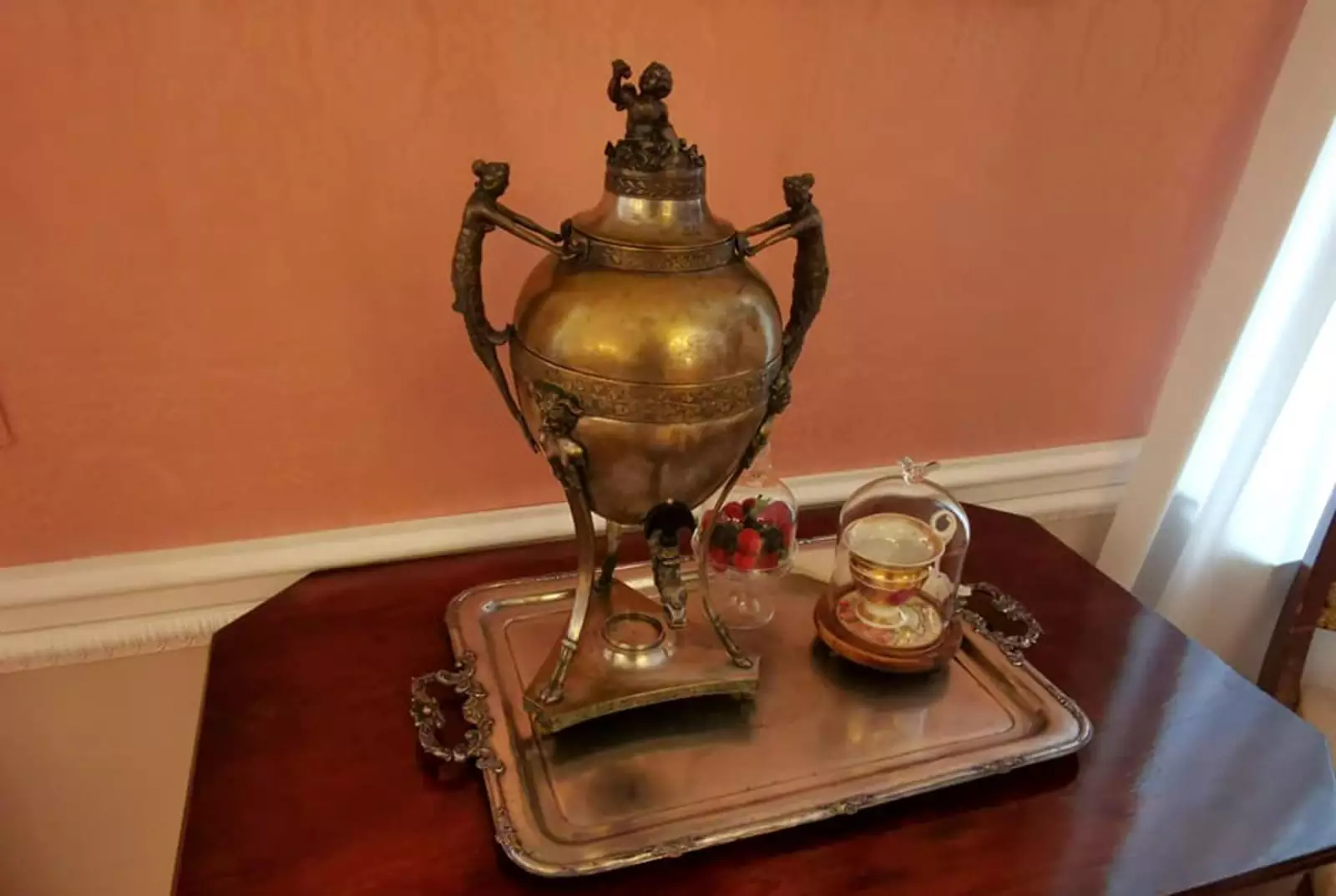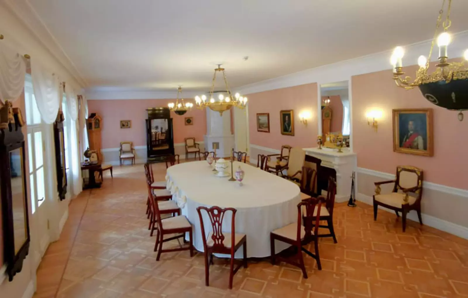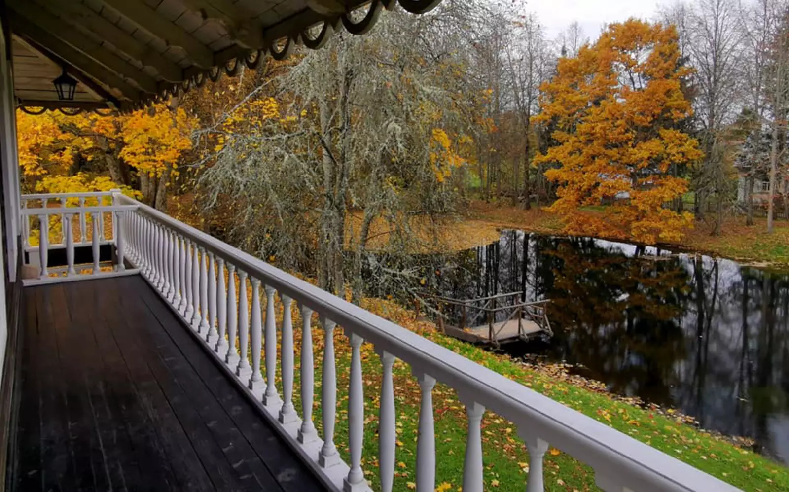 На второй этаж не пускали — Россия. По мне удалось договориться, чтобы на пару минут подняться, это даёт законченный образ роскошного дома. Из комнат второго этажа красив вид на аллею, ведущую к озеру, и беседку на берегу.