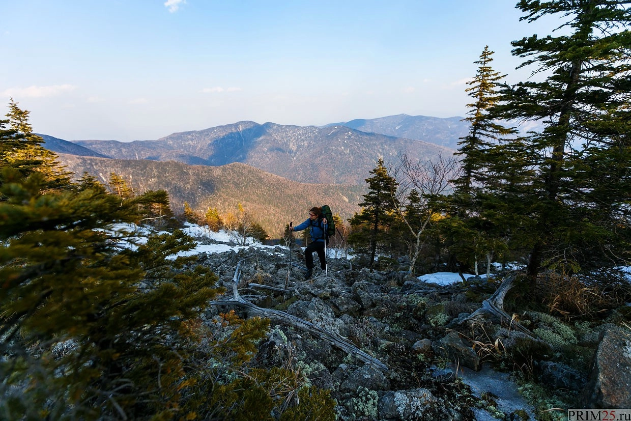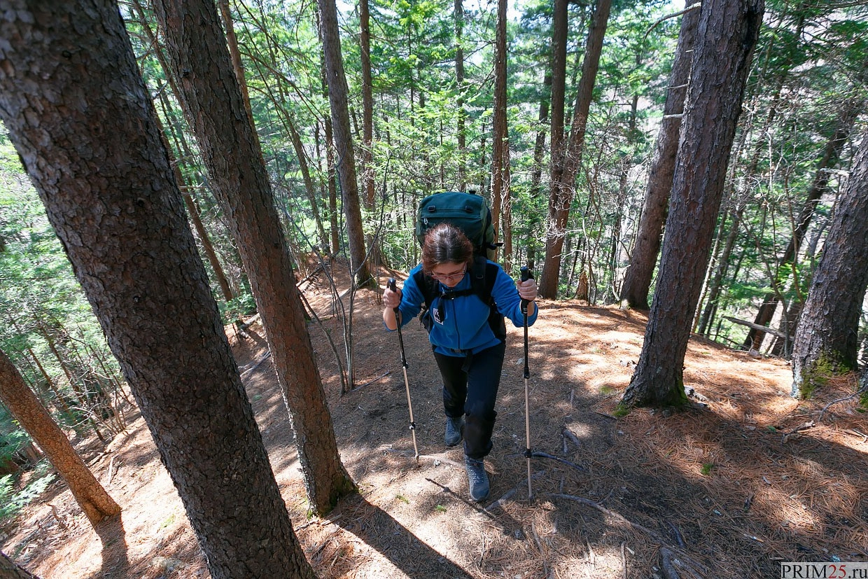 Маршрут начинается с крутого подъема — чем-то это напомнило восхождение на Читинзу. Через три минуты подтягиваний я запыхалась и стала ненавидеть свой зеленый рюкзак, он тянул меня вниз и упорно отдавливал плечи. Приятная весенняя погода моментально превратилась в пекло. Внезапно Серёжа предложил мне свои треккинговые палки (наверное, вид был совсем печальный). Пока я пыталась правильно ими пользоваться (а там целая система), вся наша компания заметно замедлила ход и слегка разделилась. Виолетта и Тимофей пошли вперед — ночевать они не собирались, поэтому дорожили каждой минутой. Чтобы и нам не пришлось ночевать на вершине несколько дней (ведь нужны фото не только рассвета, но и заката), Сережа решил забрать у меня из рюкзака спальник и воду. Забрал и рванул вперед — в следующий раз его увидели уже наверху.