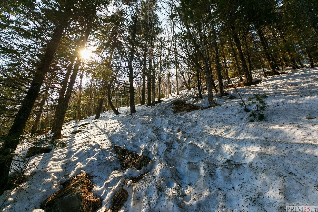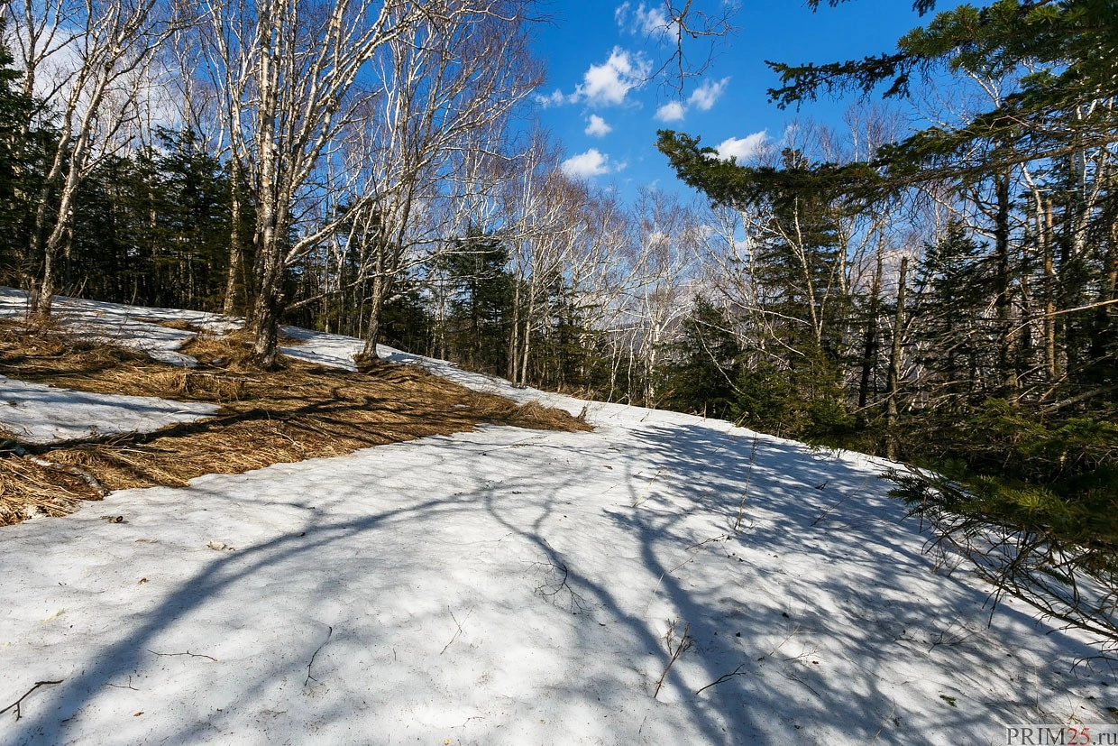 Только я начала поражаться разнице с мартовским восхождением на Воробей (там была совсем зимняя сказка, а здесь уже почти лето), как по пути стали встречаться куски подтаявшего снега. С подъемом их становилось всё больше. Спустя еще минут 15 обходить их уже не получалось, а затем мы стали идти по липкому насту. А это, во-первых, скользко, во-вторых, мокро.