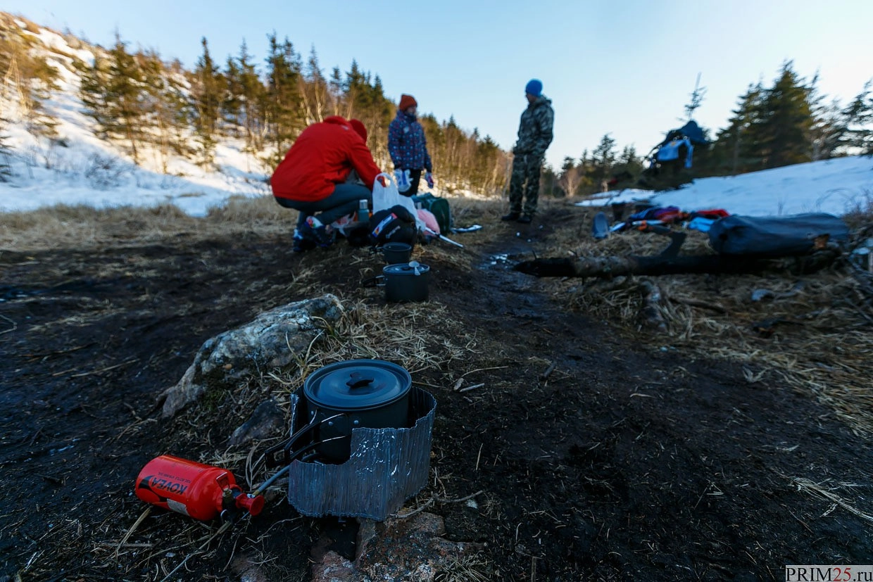 Влажные вещи мы развесили на ближайшей елке и хотели развести костер, чтобы их просушить и согреться самим. Хоть ветра и не было, но к вечеру всё же стало прохладнее. Ребята пошли за дровами и вернулись почти ни с чем — туристы выгребли уже всё до нас. Надежда на тепло растаяла, но как раз поспела гречка с тушенкой. В походе это зелье согревает не хуже любого костра, хотя за право быть лидером в этом деле легко поспорит и горячий сладкий чай из родниковой воды.