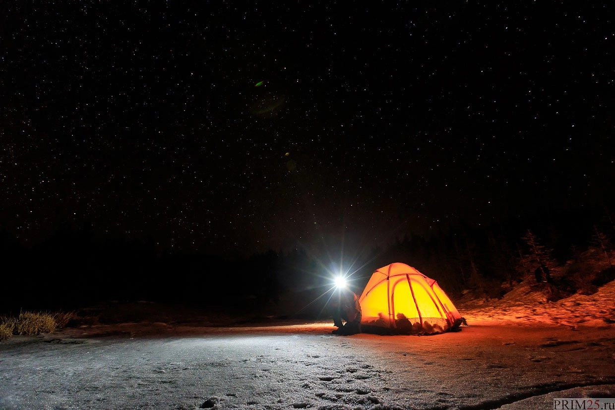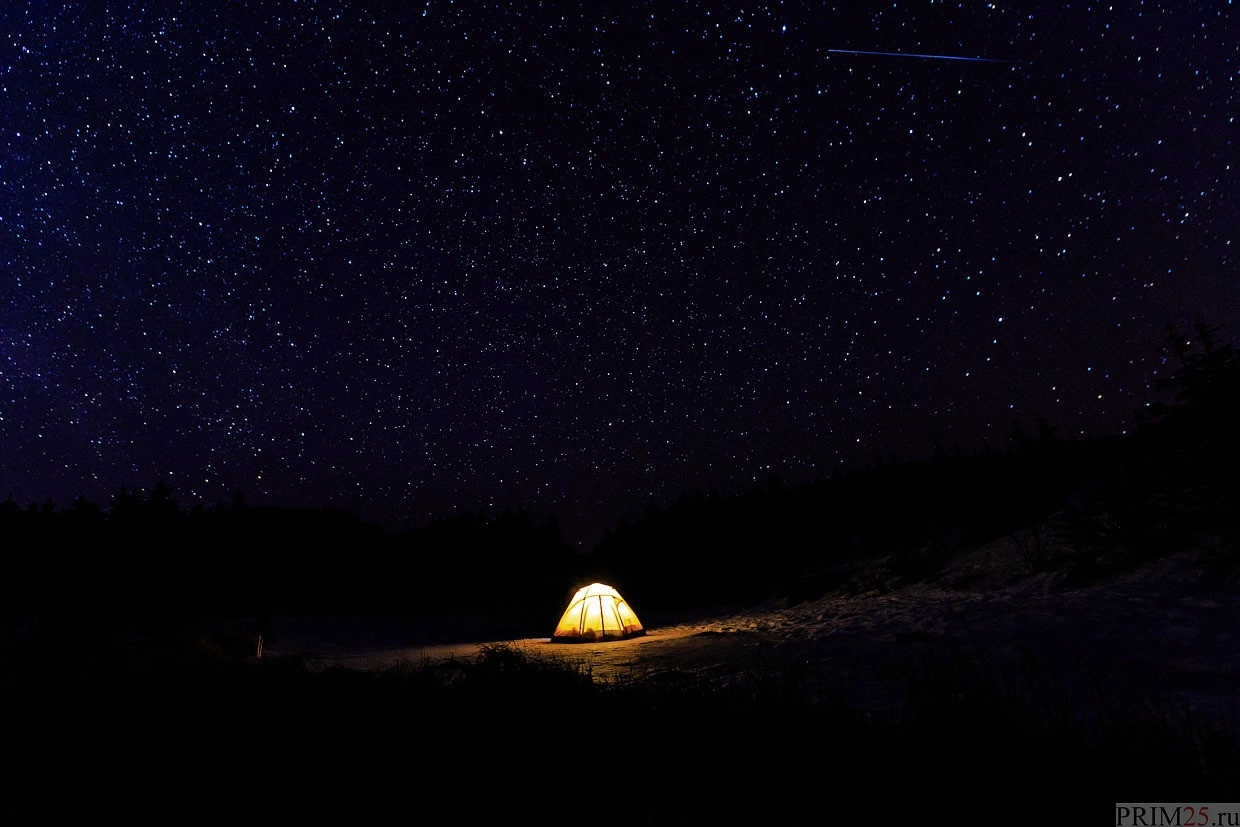 Оставалось только поверить ребятам и убрать из головы въедливый мотив: «Между нами тает лед, пусть теперь нас никто не найдет…» Тем временем смеркалось. Палатка была давно разобрана, коврики-спальники разложены, лагерь плавно перекочевал на озеро. Мы снова выпили чаю, и тогда наконец-то вылезли звёзды. Они рассыпались по всему небосводу, оставалось только стоять и крутить шеей, чтобы насладиться большей панорамой.