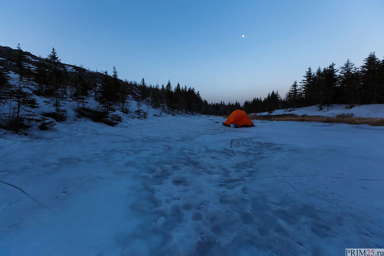 Собирать палатку было решено на льду озера — там по крайней мере нет грязи. Пока прутики вставлялись в петельки, а затем в дырочки, на горизонте появились Саша и Сережа. То ли мы долго раскачивались, то ли они так быстро отсняли материал. «О, вы решили палатку на озере поставить? А что, отличная идея!» — удивились ребята, тем самым действительно определив место нашей ночевки. Я пыталась возражать.