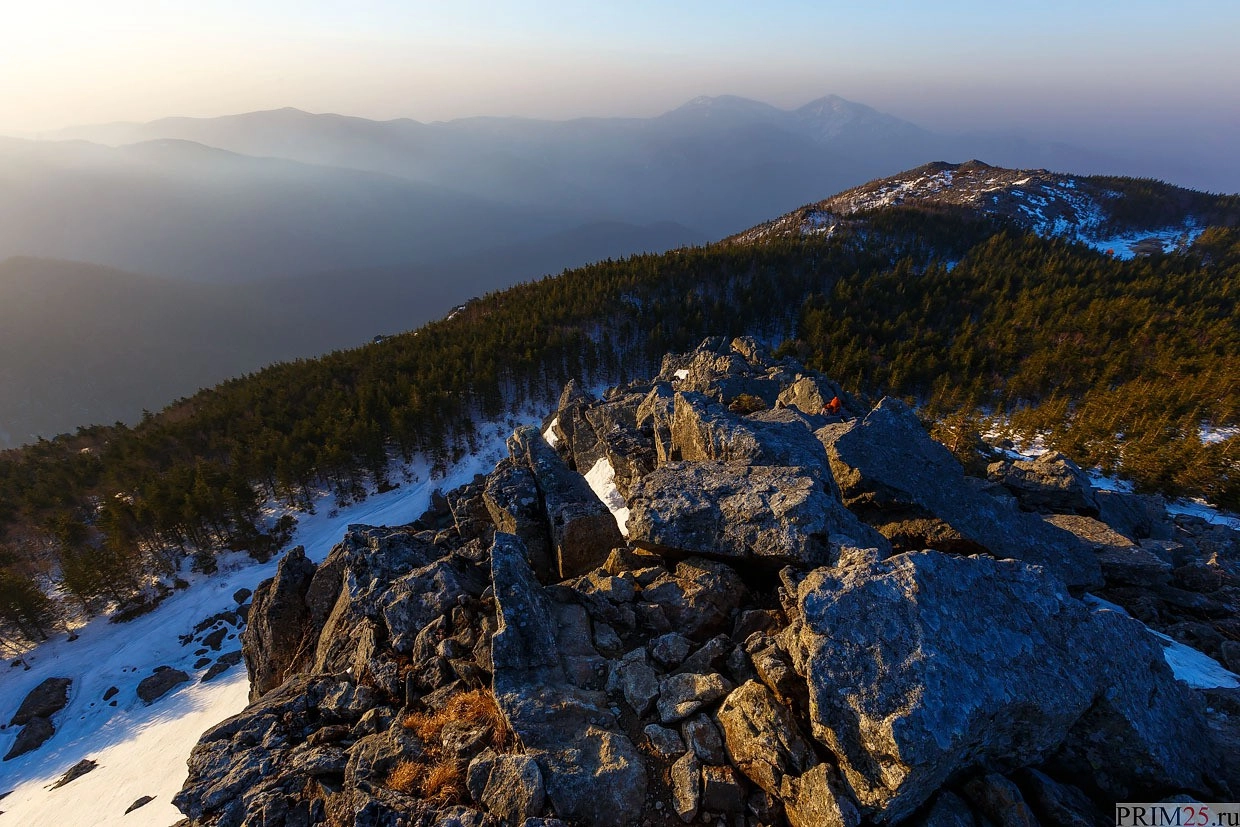 Утопая в снегу (хотя за ночь он подмерз и стал меньше проваливаться), взбираясь по «живым» камням, кедровому стланику и сопротивляясь сильному ветру, спустя полчаса мы, наконец, забрались к кресту, а затем и к тригонометрическому пункту. Для меня этот «отдых» на вершине стал настоящим испытанием. Холод. Ничего не видно (забыла надеть резинку для волос, и они выбивались из-под шапки и лезли в глаза). Ветер реально качал в стороны (даже задумалась, стоит ли худеть). Ничего не слышно. Камни под огромными ботинками то и дело пытались выскользнуть… Как в таких условиях люди умудряются фотографировать окрестности? Как здесь можно сидеть и думать о вечном?