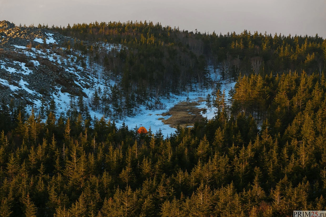 Да, поляна действительно очень красивая. Маленькое озеро (озеро Духов), уже немного оттаявшее, утопает в ельнике, вокруг лежит снег, из-под которого выглядывают листья брусники и голубики. Чуть выше купается в лучах заката вершина — путь к ней лежит через небольшой хребет с ельником и несколько каменных насыпей.