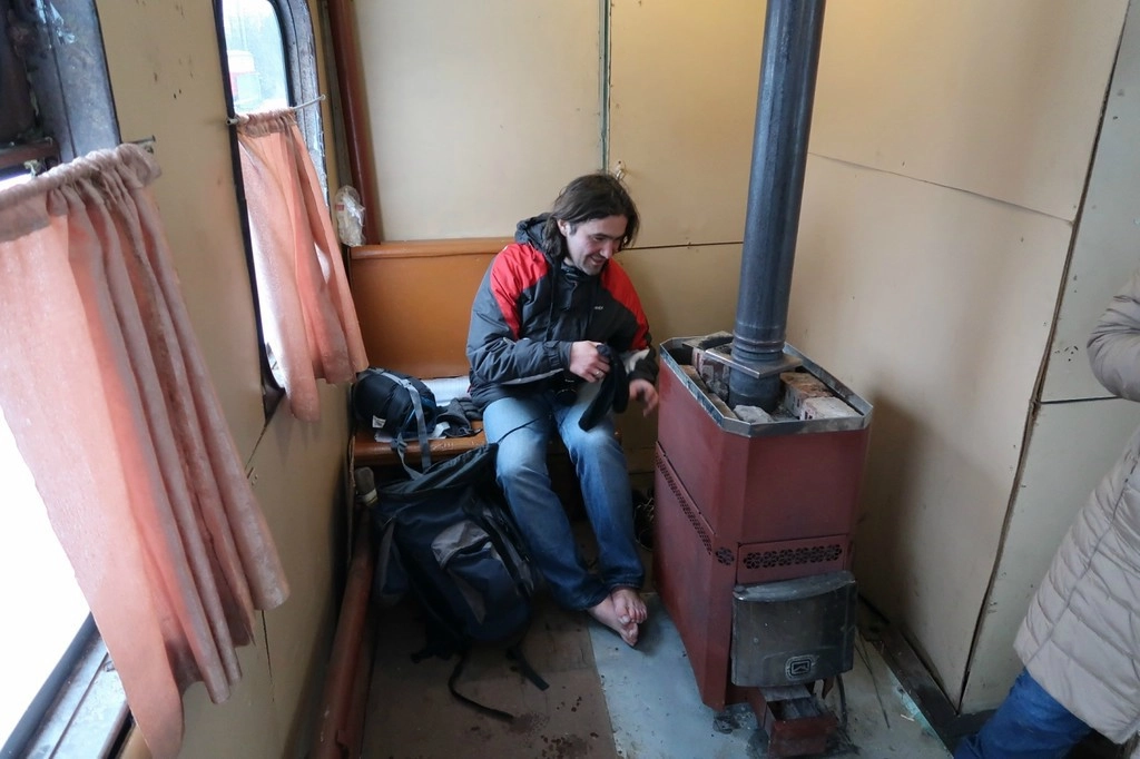 Я в эту поездку взял неудачные быстропромокающие ботинки, и всю дорогу неистово страдал. Поэтому неотъемлемый спутник узкоколейного вагона — тёплая печка-буржуйка оказалась очень кстати. На ней можно было полностью высушиться (потом снова промокнуть и снова высушиться).